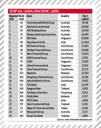 Dẫn đầu khu vực này là các ngân hàng của Australia, còn Hàn Quốc chiếm đến 7 vị trí trong top 25 ngân hàng này. Ngành ngân hàng Thailand ghi nhận sự tăng trưởng mạnh với 3 ngân hàng có mặt trong top này, cùng với Singapore.