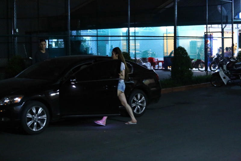 Ngay sau khi kết thúc đêm mở màn "Bước nhảy hoàn vũ", nữ ca sĩ thay vội bộ váy quyến rũ và diện quần short ngắn, áo thun đơn giản chở bạn diễn đi ăn khuya bằng xế hộp riêng.