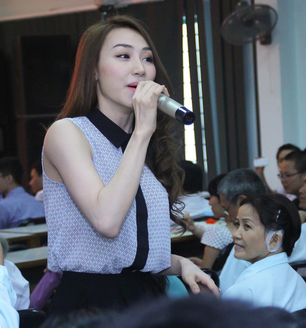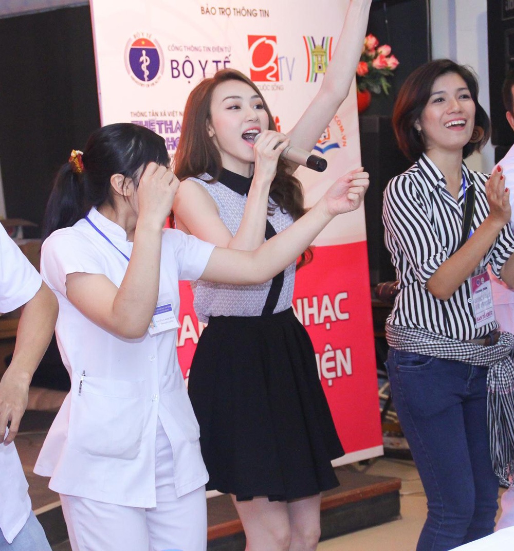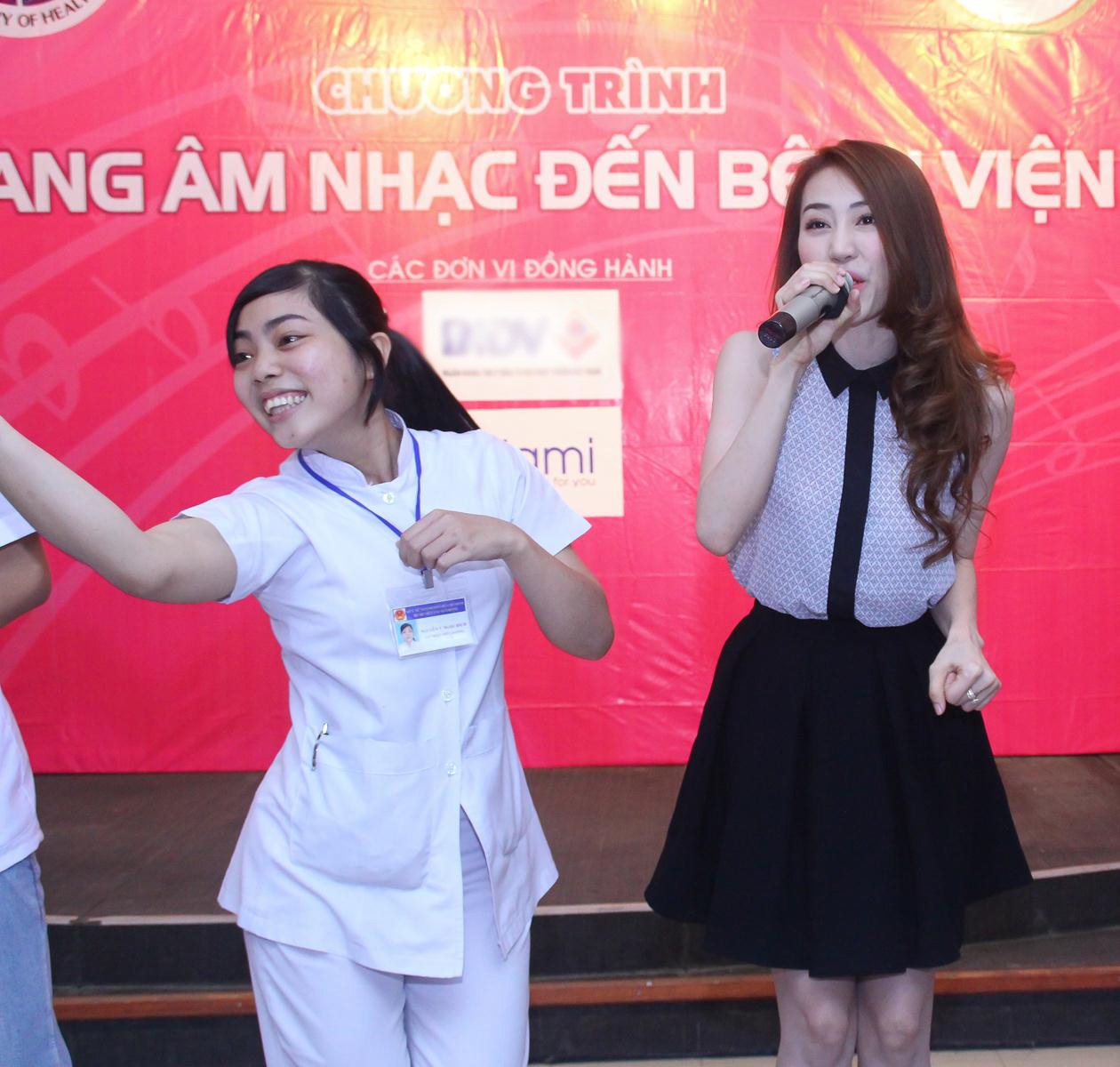 | Nữ ca sĩ ăn mặc giản dị, trang điểm nhẹ nhàng khi hát trong buổi từ thiện. Tuy vậy, cô vẫn được nhiều bệnh nhân khen xinh xắn, dễ gần. |