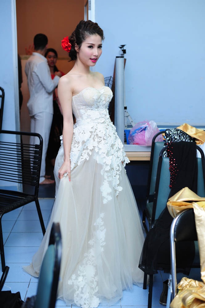 | Nữ diễn viên Váy hồng tầng 24 thay mấy kiểu váy cho từng phần trình diễn khác nhau trong đêm thi. |