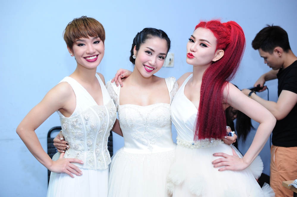 | Trà My Idol khoe dáng bên Ốc Thanh Vân và Thu Thủy. Tất cả các thí sinh nữ đều mặc đầm trắng để chuẩn bị cho tiết mục mở màn. Họ sẽ nhảy múa trên nền nhạc ca khúc Bóng ma trong nhà hát do Dương Hoàng Yến và Nguyễn Trần Minh Sang thể hiện. |