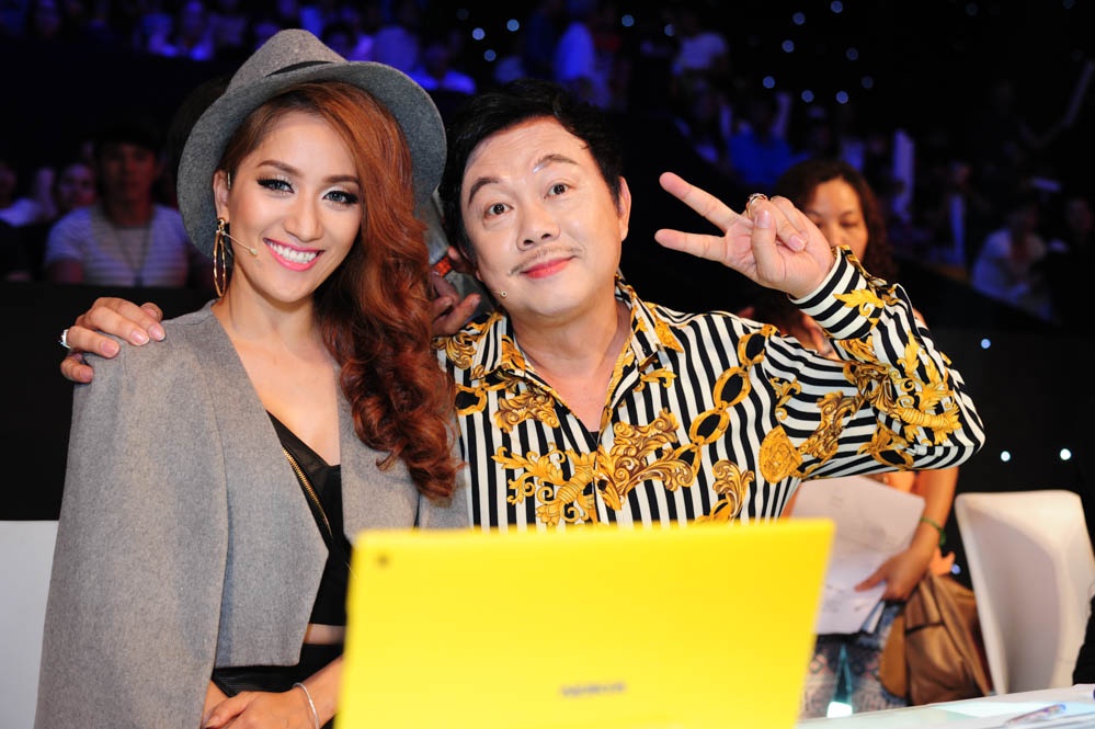 | Phút xì tin của hai giám khảo. Đây là lần thứ hai Chí Tài làm "hàng xóm" của Khánh Thi trên ghế nóng BNHV. |