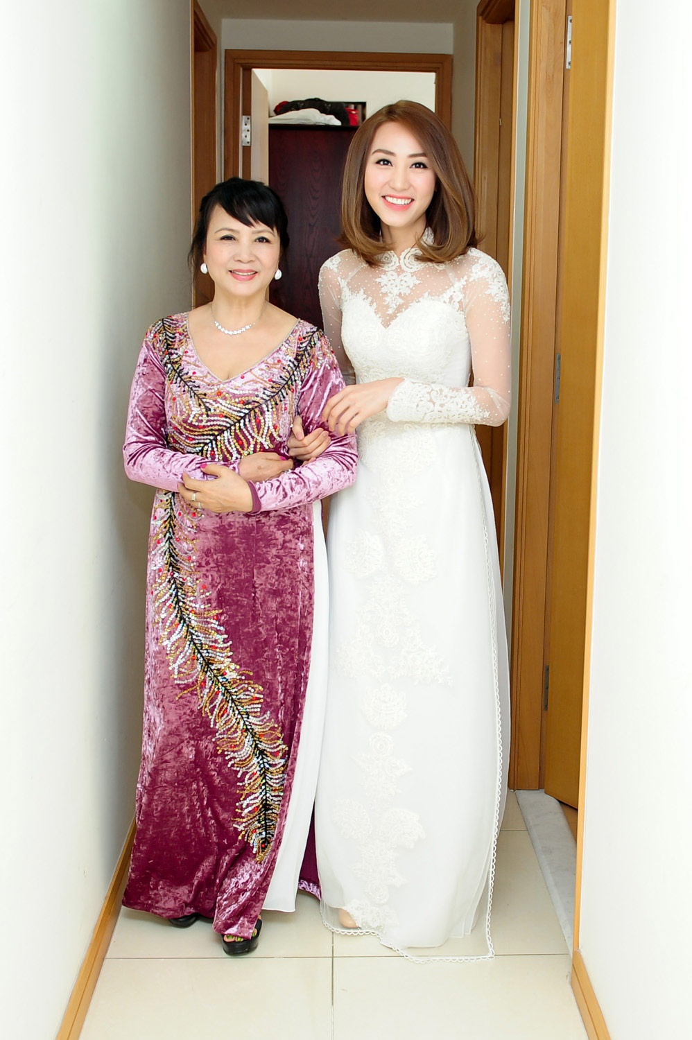 | Sau khi các thủ tục trao lễ tiến hành, mẹ Ngân Khánh dẫn con gái diện kiến nhà trai. Nữ diễn viên sinh năm 1985 rạng ngời trong chiếc áo dài màu trắng. |