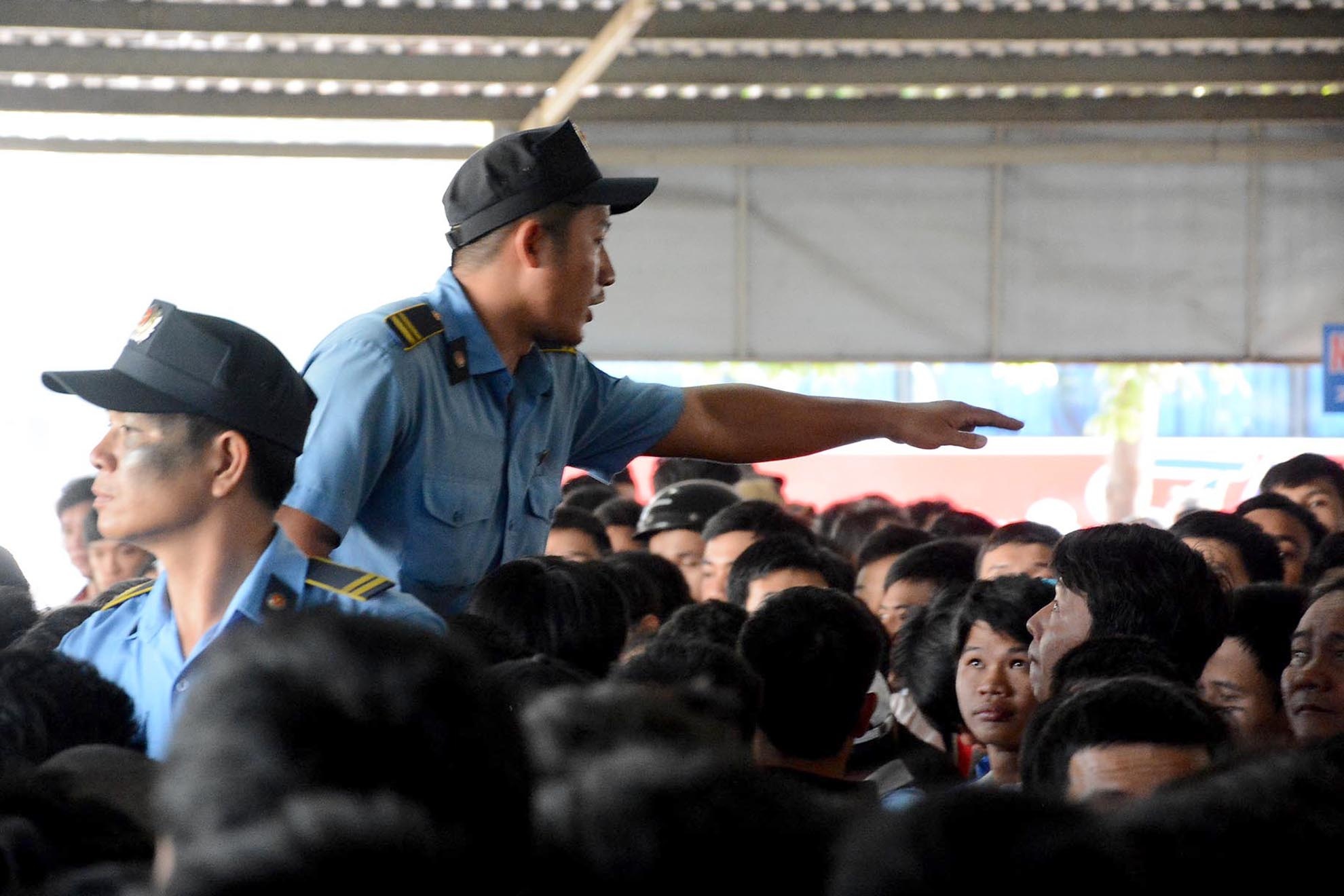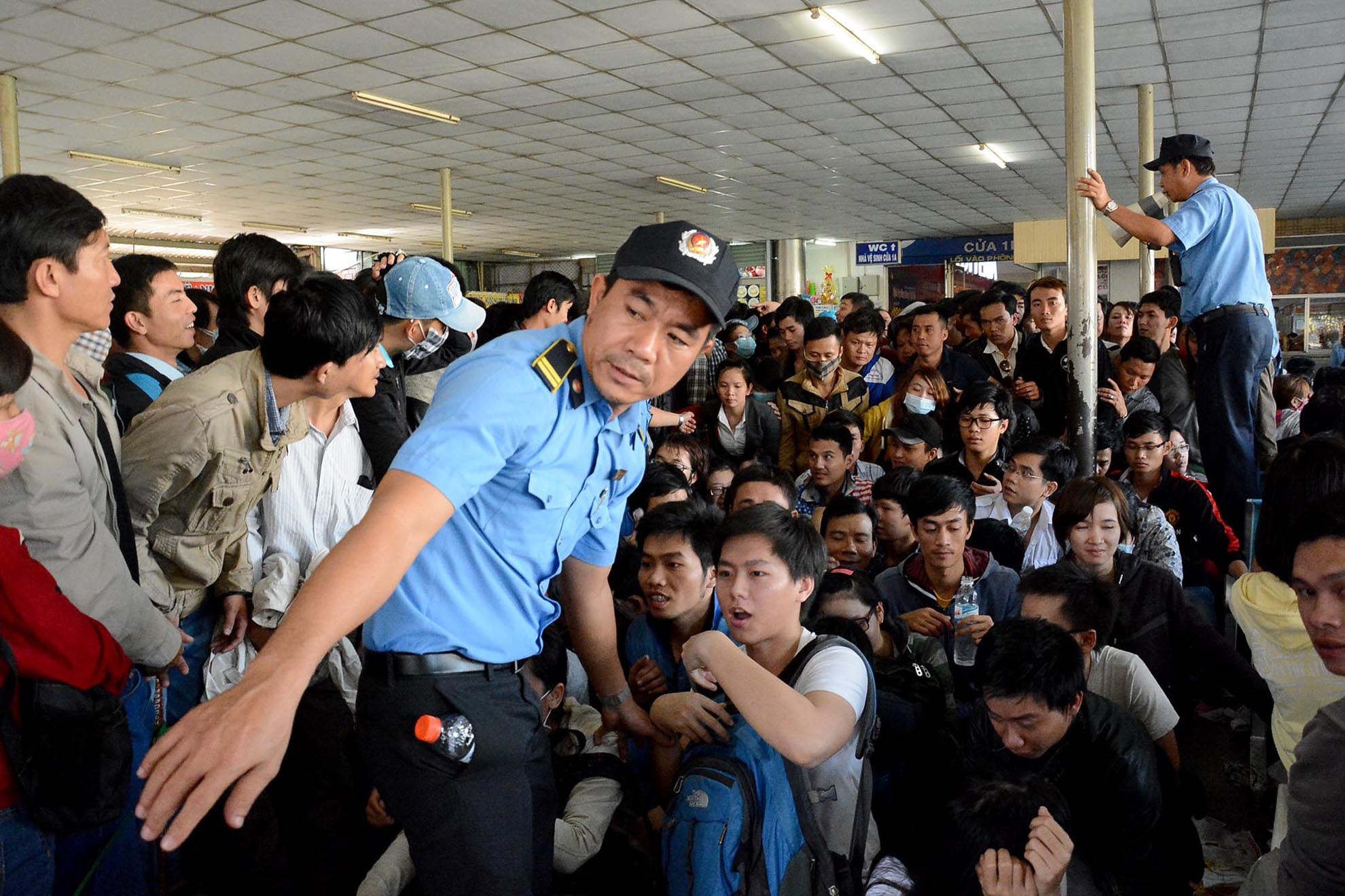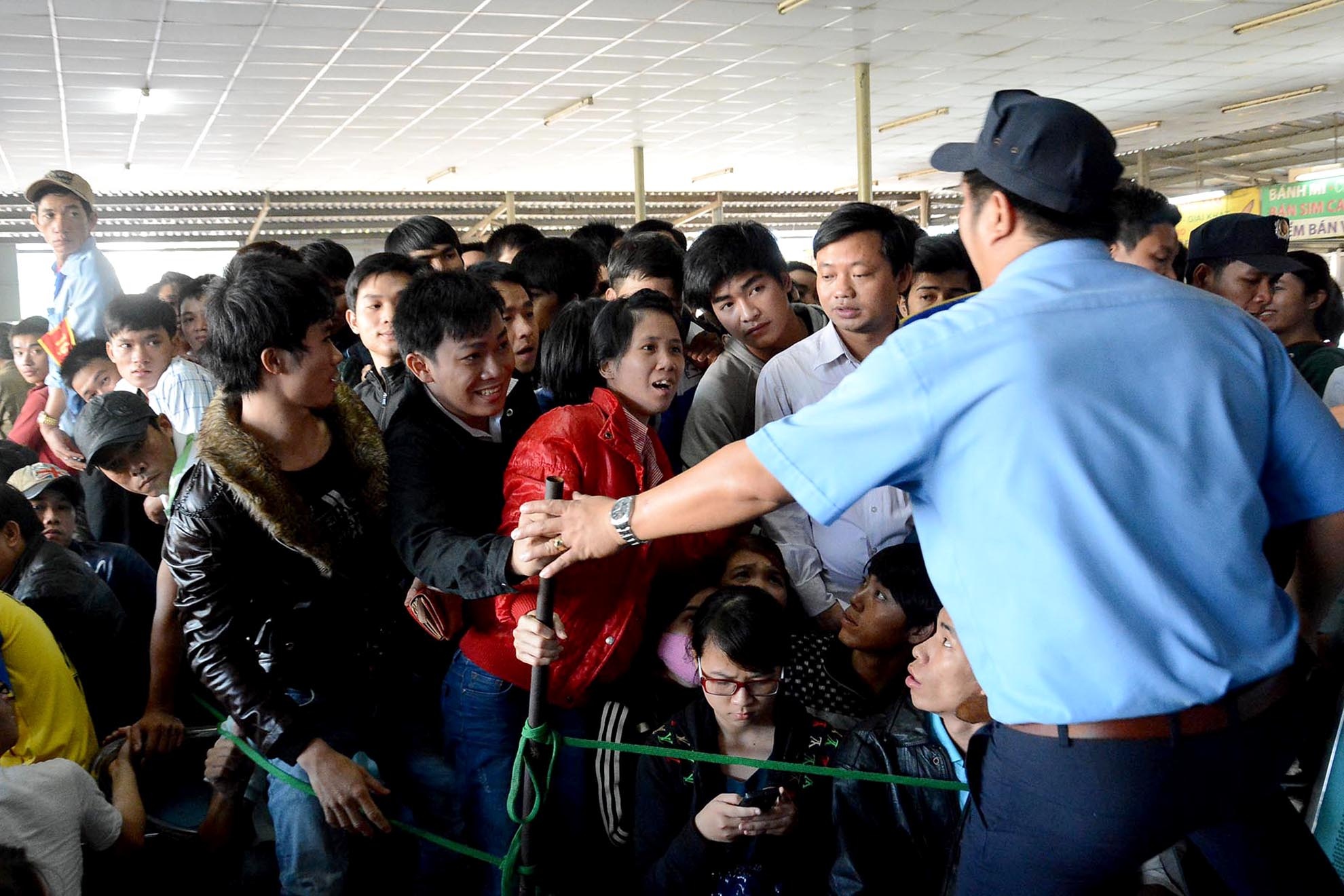 | Lượng người chờ mua vé tại bến xe quá đông nên lược lượng bảo vệ đã phải làm việc hết sức vất vả. |