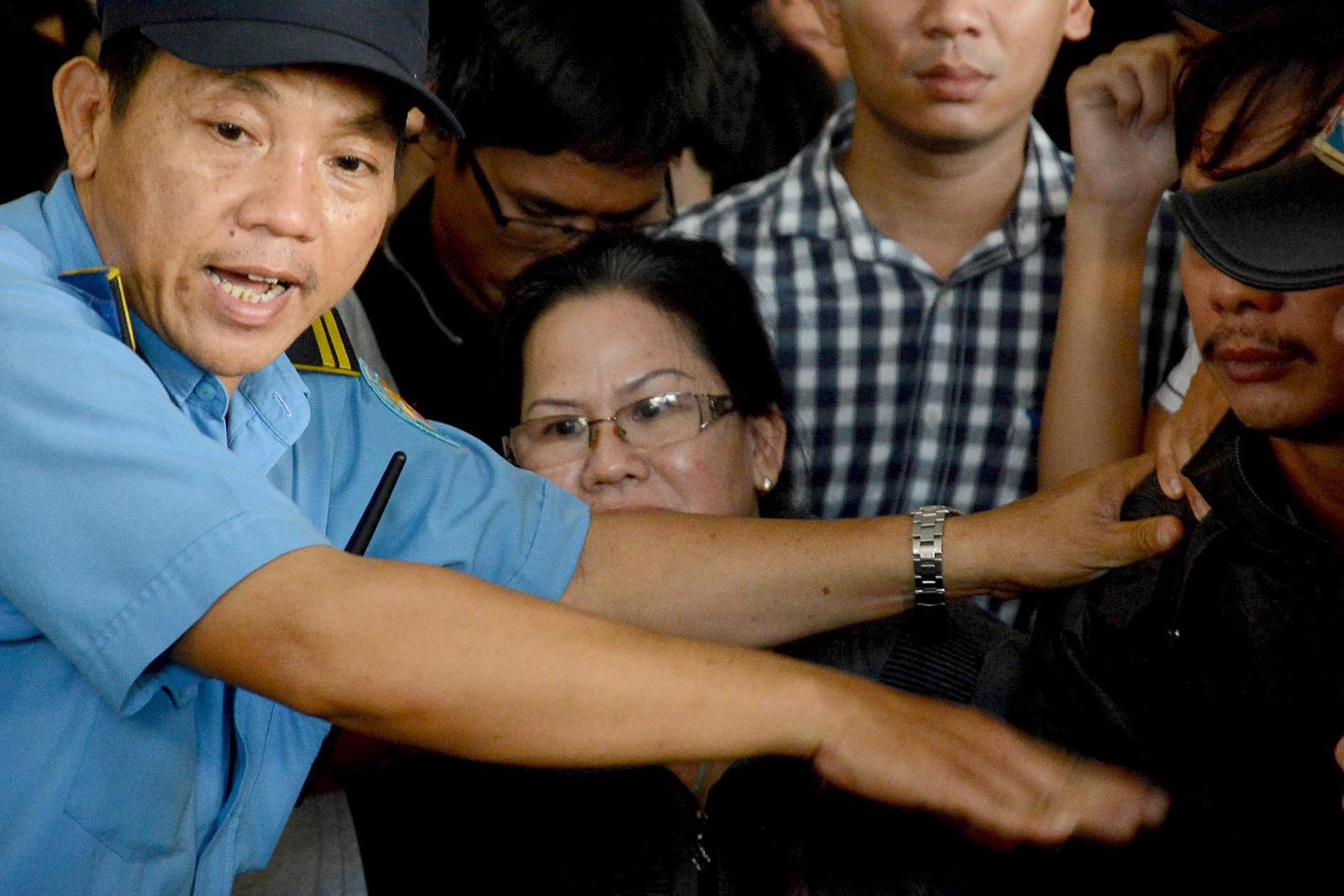 | Một phụ nữ vui mừng khi được gọi tên lên quầy nhận vé. |