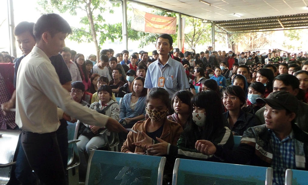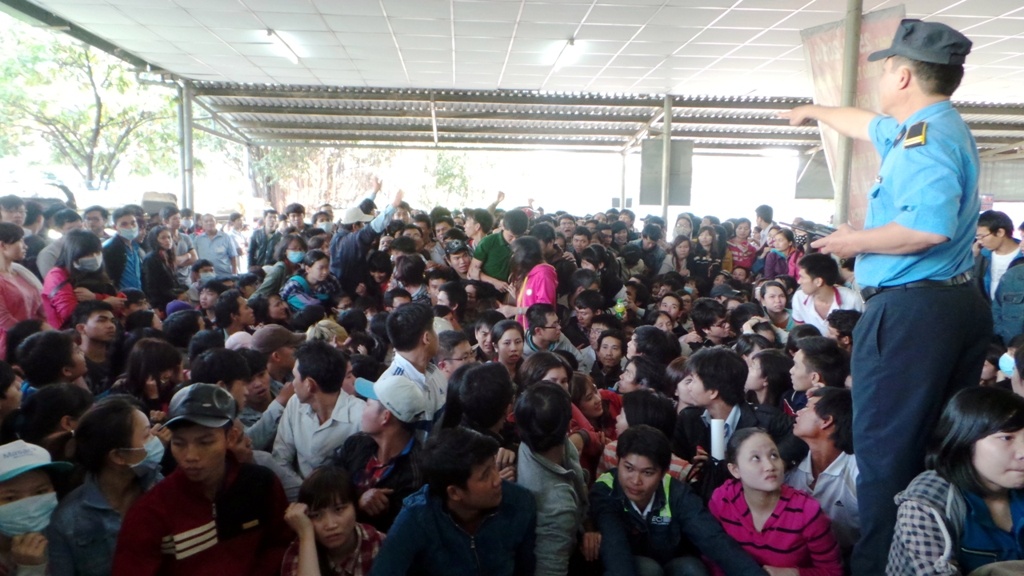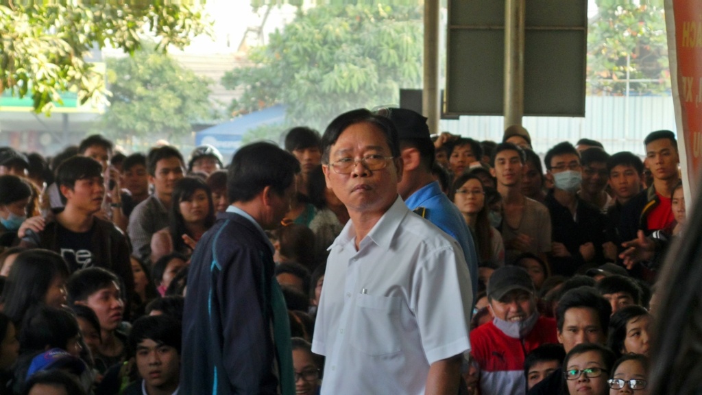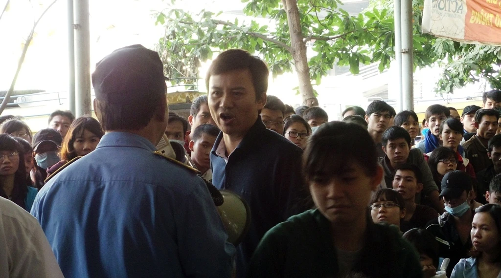 | Sau đợt phát phiếu thứ 2, tình hình trở nên "nóng" lên bởi nhiều người muốn được lên ghế ngồi chờ, qua đó sớm mua được vé. Lực lượng bảo vệ phải vất vả kiểm soát đám đông la ó, chen lấn xô đẩy lên phía trên. Ông Thượng Thanh Hải - Giám đốc bến xe Miền Đông đã trực tiếp xuống nhà chờ 1B ổn định trật tự. |