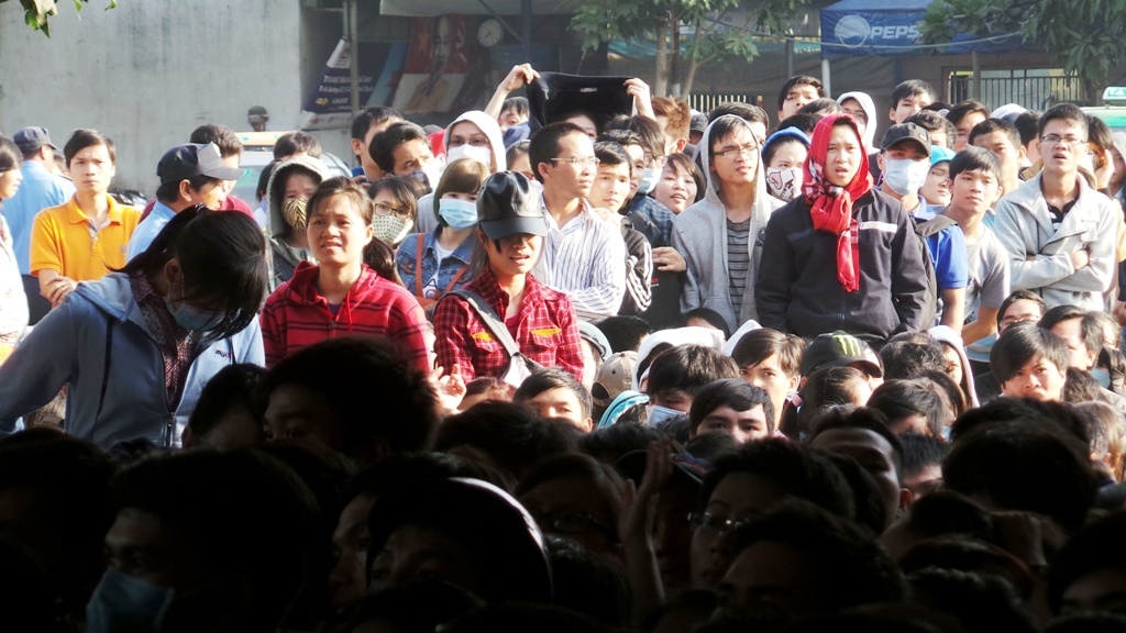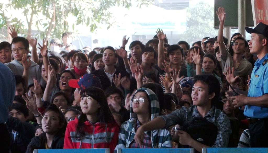 | Một số cô gái mệt mỏi trong sự xô đẩy từ những người phía sau muốn chen lên. Nhiều người đã bật khóc vì không chịu nổi sức ép trong đám đông hỗn loạn. Trong lúc tình trạng lộn xộn đến đỉnh điểm, một cô gái đã ngất xỉu, được nhân viên nhà xe nhanh chóng tách khỏi đám đông, đưa vào khu vực riêng của nhà xe để chăm sóc. |