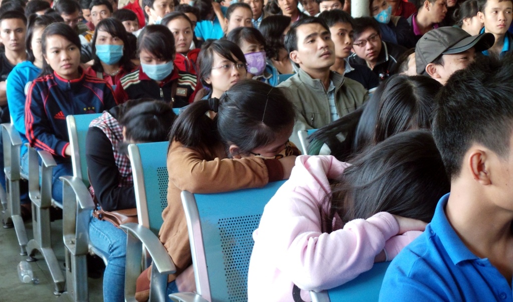 | Những người chờ đợi từ khuya dù mệt mỏi vẫn không dám rời vị trí. Có nhóm đi nhiều người, trong đó một người vào xếp hàng, những người còn lại tranh thủ chợp mắt để "thay ca" cho người xếp hàng ra nghỉ ngơi. Nhiều nhân viên nhà hãng xe Phương Trang cùng lực lượng bảo vệ bến xe được huy động giữ gìn trật tự và chỉ dẫn hành khách xếp hàng. Tuy nhiên, do lượng khách đổ về quá đông nên không thể xếp thành hàng, lối. Nhân viên nhà xe và bảo vệ có nhiệm vụ phải nhớ mặt những người đến trước để ưu tiên phát phiếu thứ tự vào mua vé. |