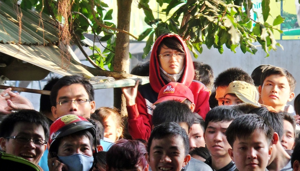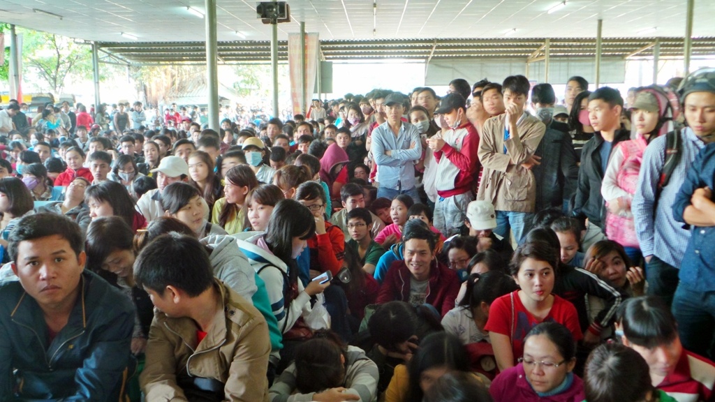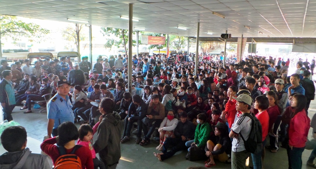 | Khoảng 6h sáng, nhà xe phát số thứ tự cho nhóm khách đến đầu tiên, vào lúc 21h tối 31/1. Thời điểm này, dòng người xếp hàng đã vượt quá khu vực nhà chờ ra bên ngoài bến xe. Tuy nhiên, hàng người di chuyển cực kỳ chậm. |