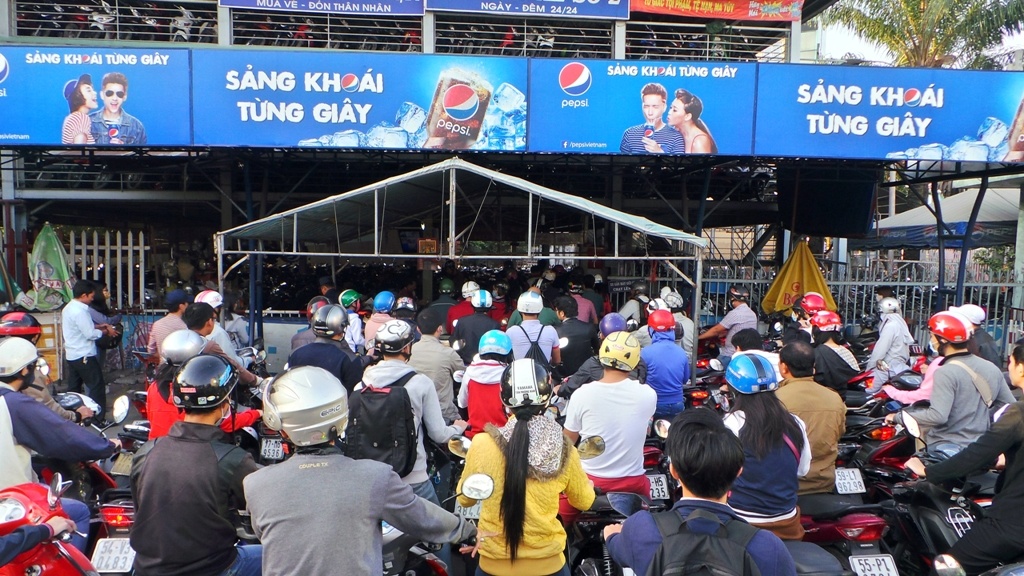 | Bên ngoài, khoảng 6h sáng 1/2, nhà giữ xe của bến xe Miền Đông bị ùn tắc nghiêm trọng bởi cả trăm người đến gửi xe đi mua vé tết. Tuy khách đông nhưng bãi xe chỉ có hai nhân viên ghi số và bấm vé nên người dân phải chờ gần 20 phút mới gửi được xe. Càng về sau, bãi xe càng đông đúc người đến gửi. |