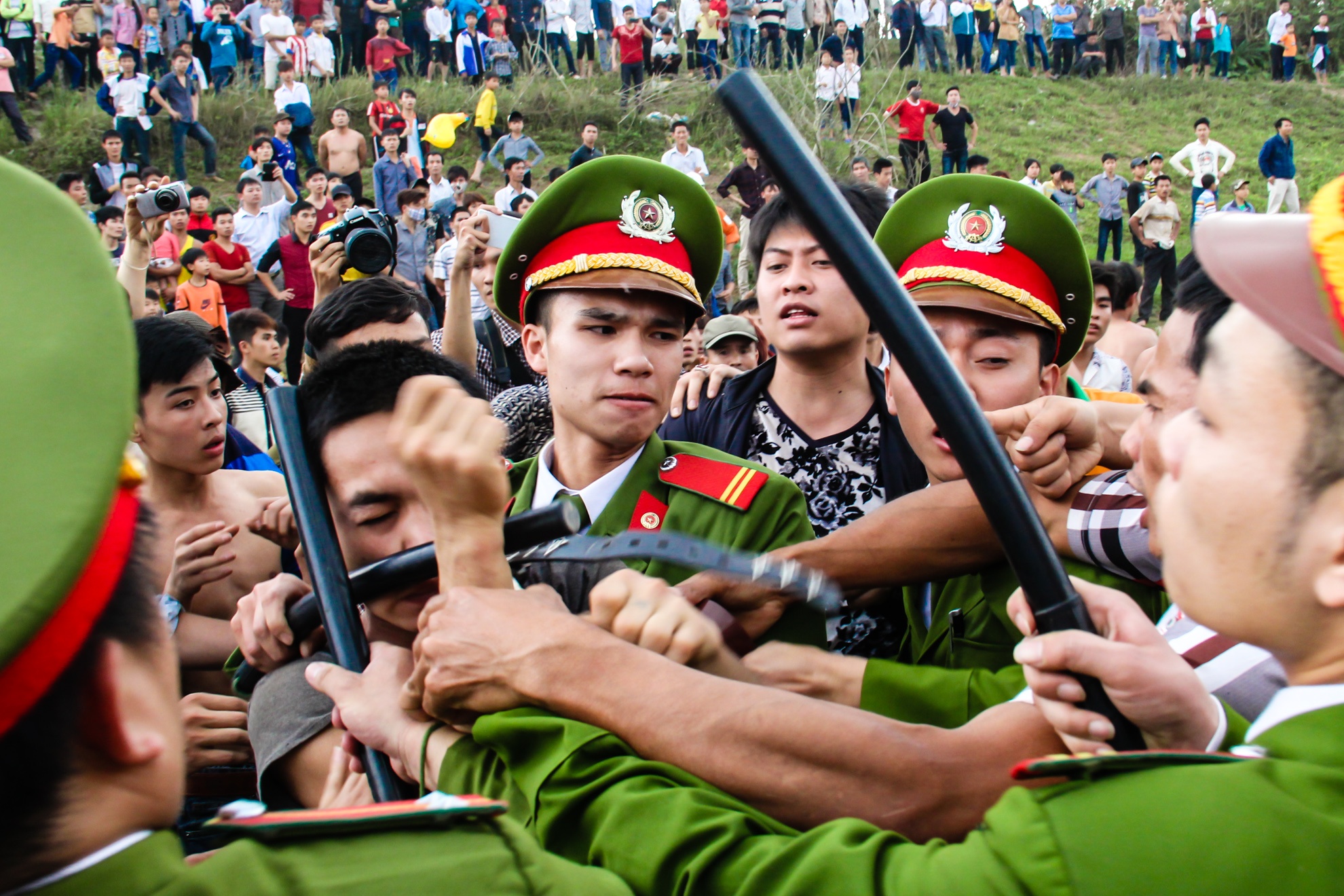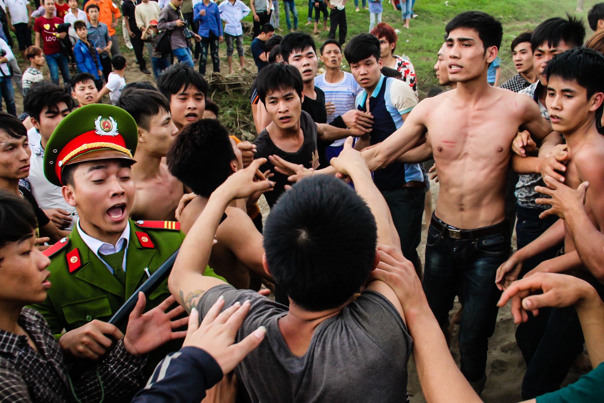 Công an khống chế, kéo nhiều thanh niên ra khỏi lễ hội sau khi họ rút dây lưng, gậy gộc đánh nhau