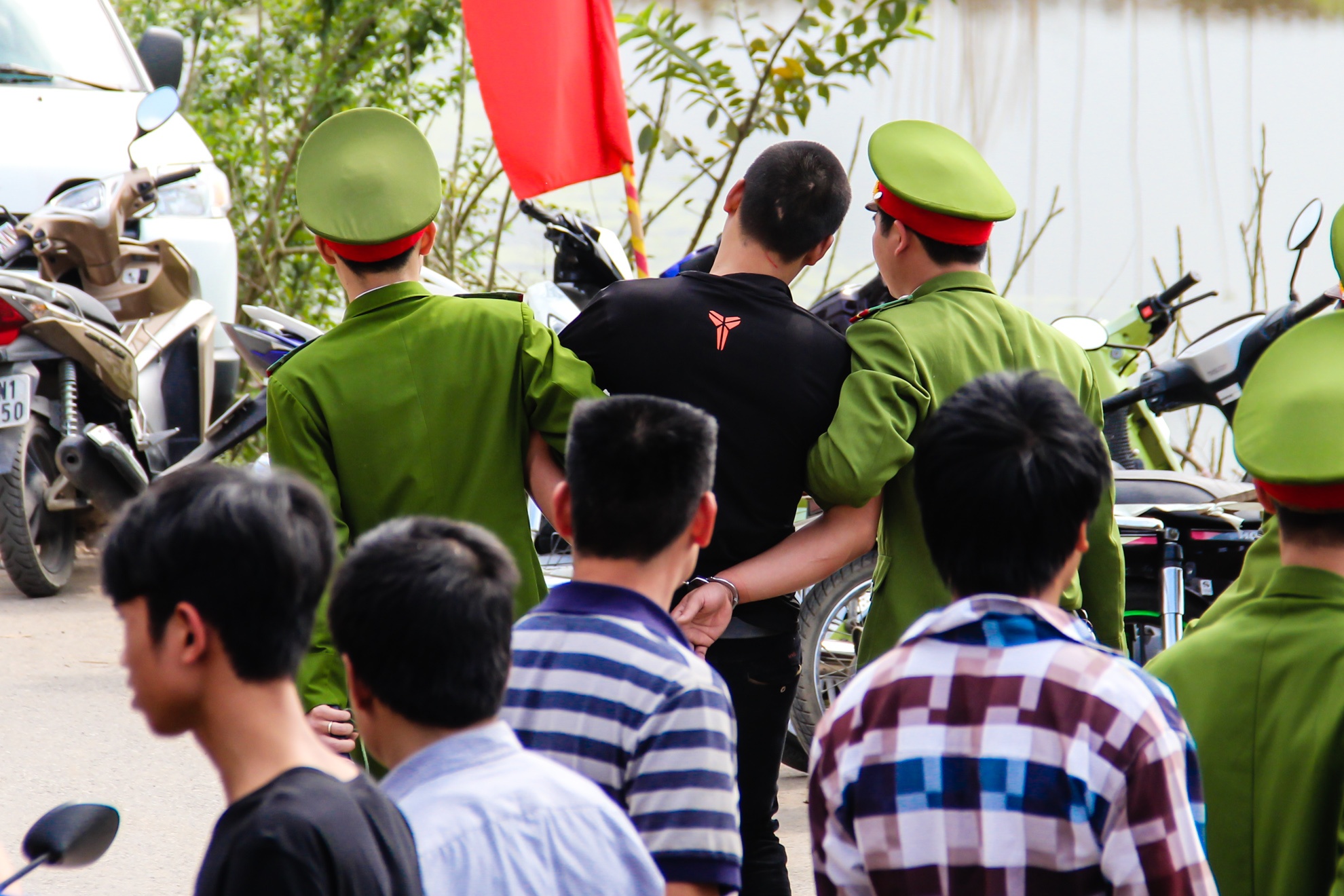 | Một thanh niên bị còng tay giải đi. |