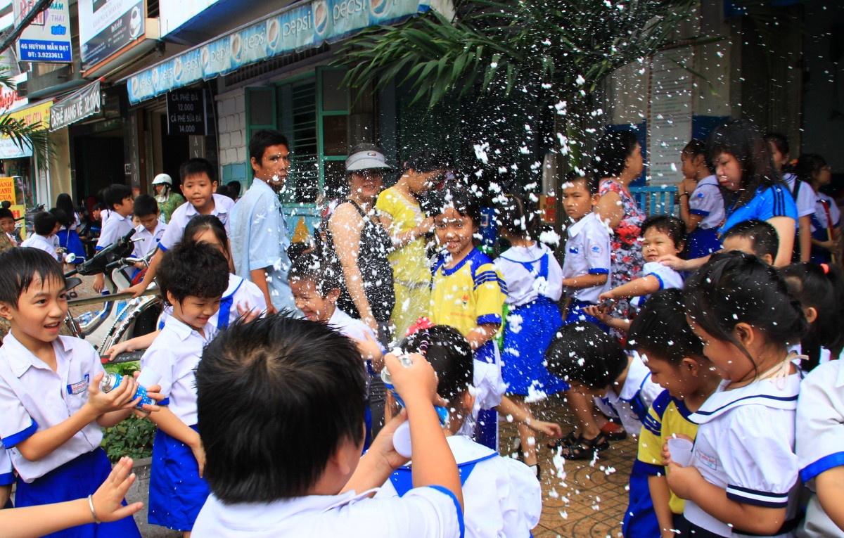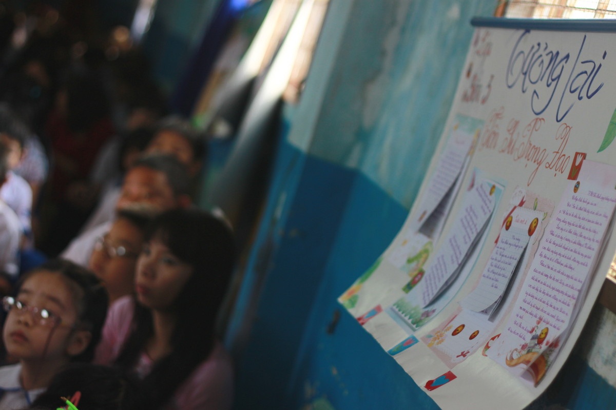 | Các học sinh được tập trung trong lớp học trước khi lên tầng cao nhất dự lễ. Lớp học rộng khoảng 20m2, với 30 học sinh mỗi lớp. Trường có tất cả 20 lớp, với 600 học sinh nhưng chỉ khoảng 300 em được dự lễ vì sân trường nhỏ. Lớp 1, lớp 5 được 20 em đi dự lễ, còn lớp 2,3,4 thì được 10 em tham gia. |