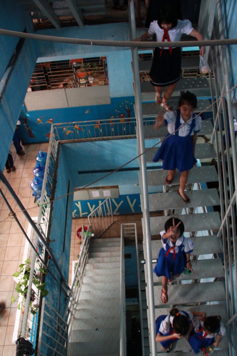 | Một em mang hoa đến trường, cầu thang chỉ đủ cho 2 người đi. |