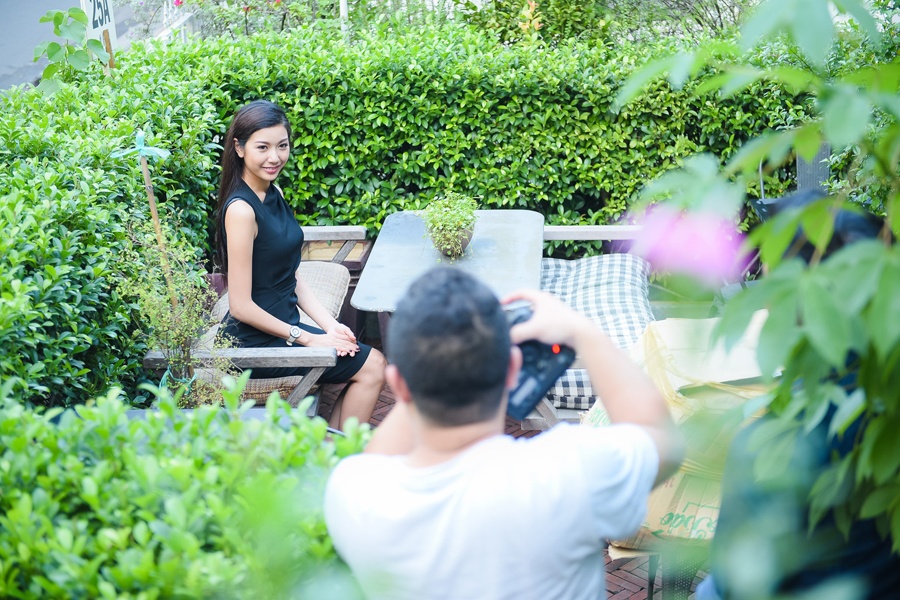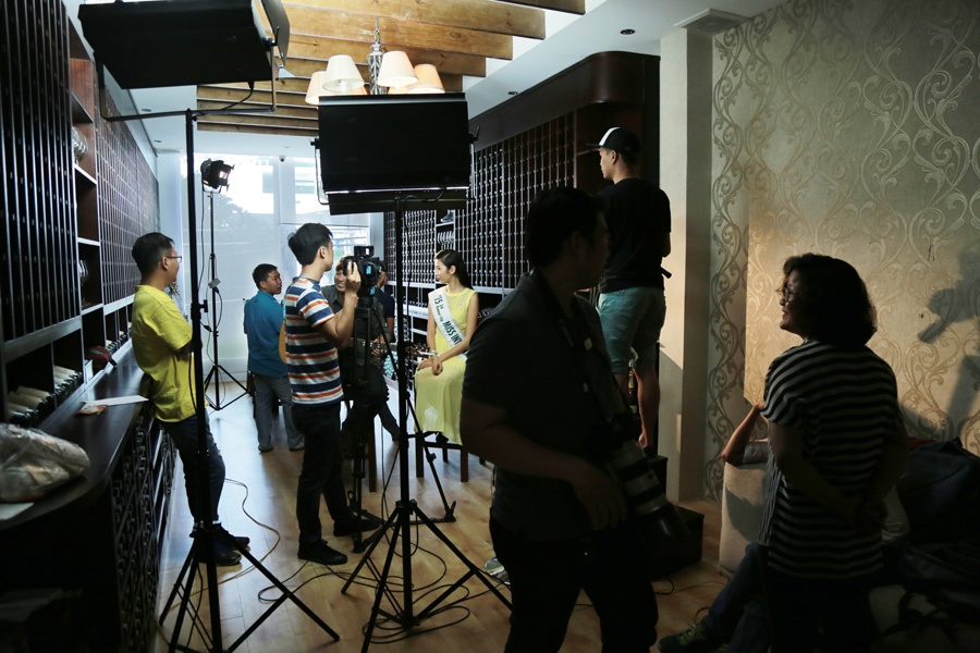 | Vừa đến điểm hẹn, á hậu nhanh chóng tham gia chụp ảnh, sau đó là trả lời phỏng vấn trực tiếp và quay hình. |