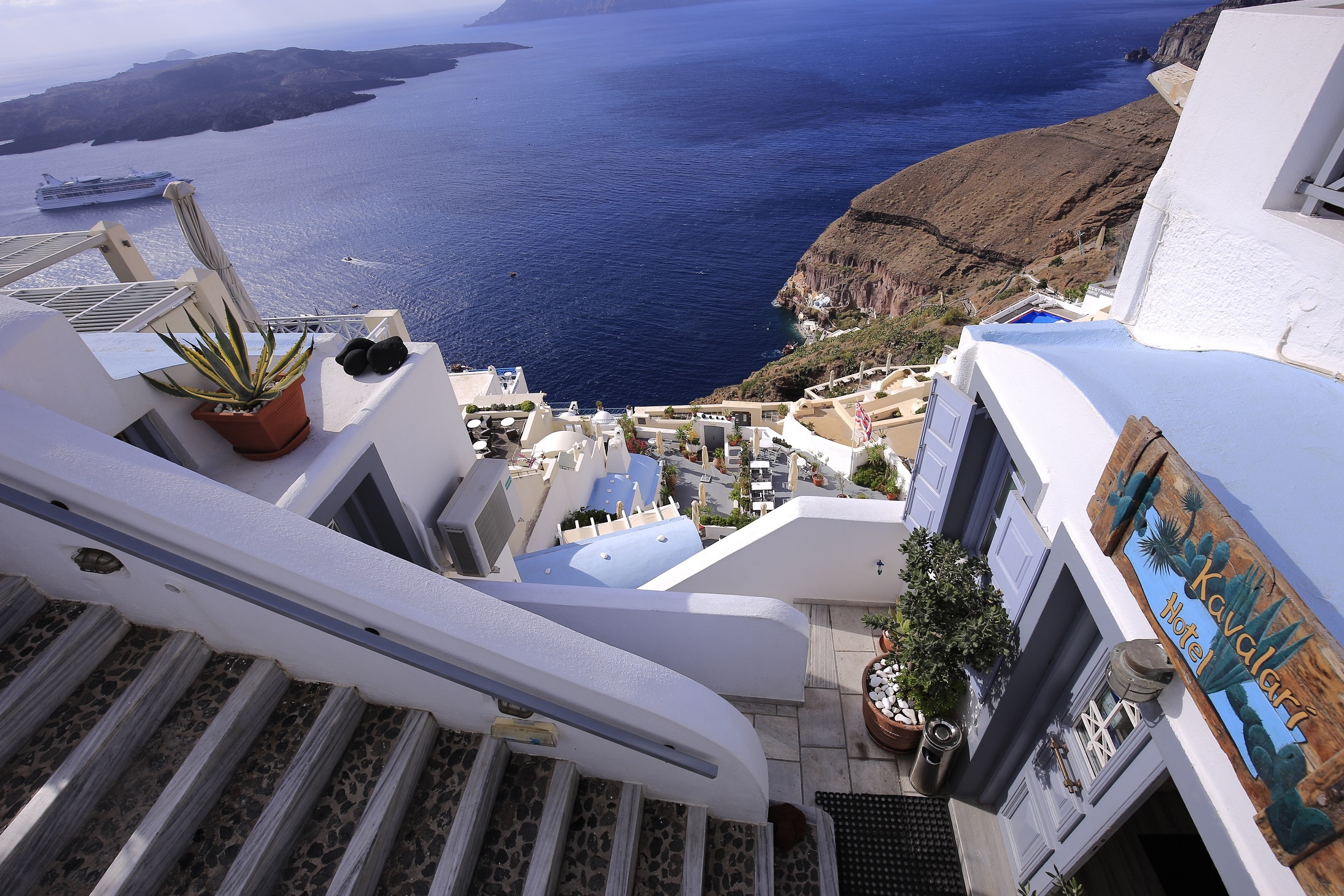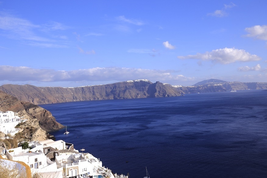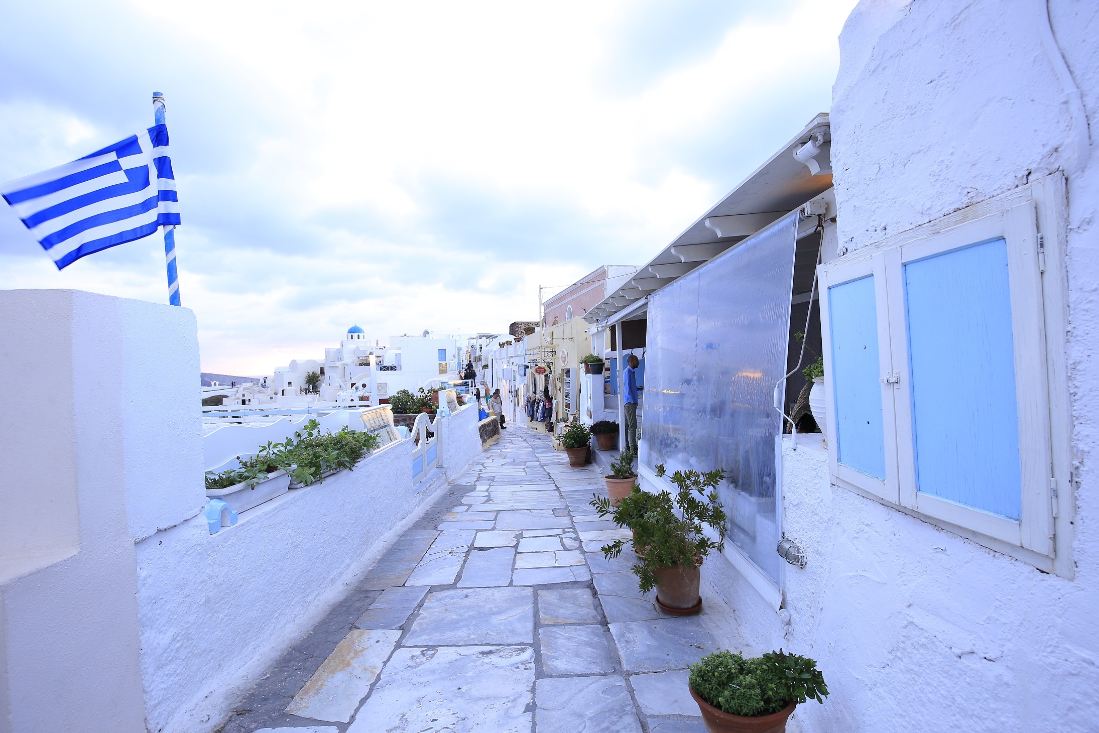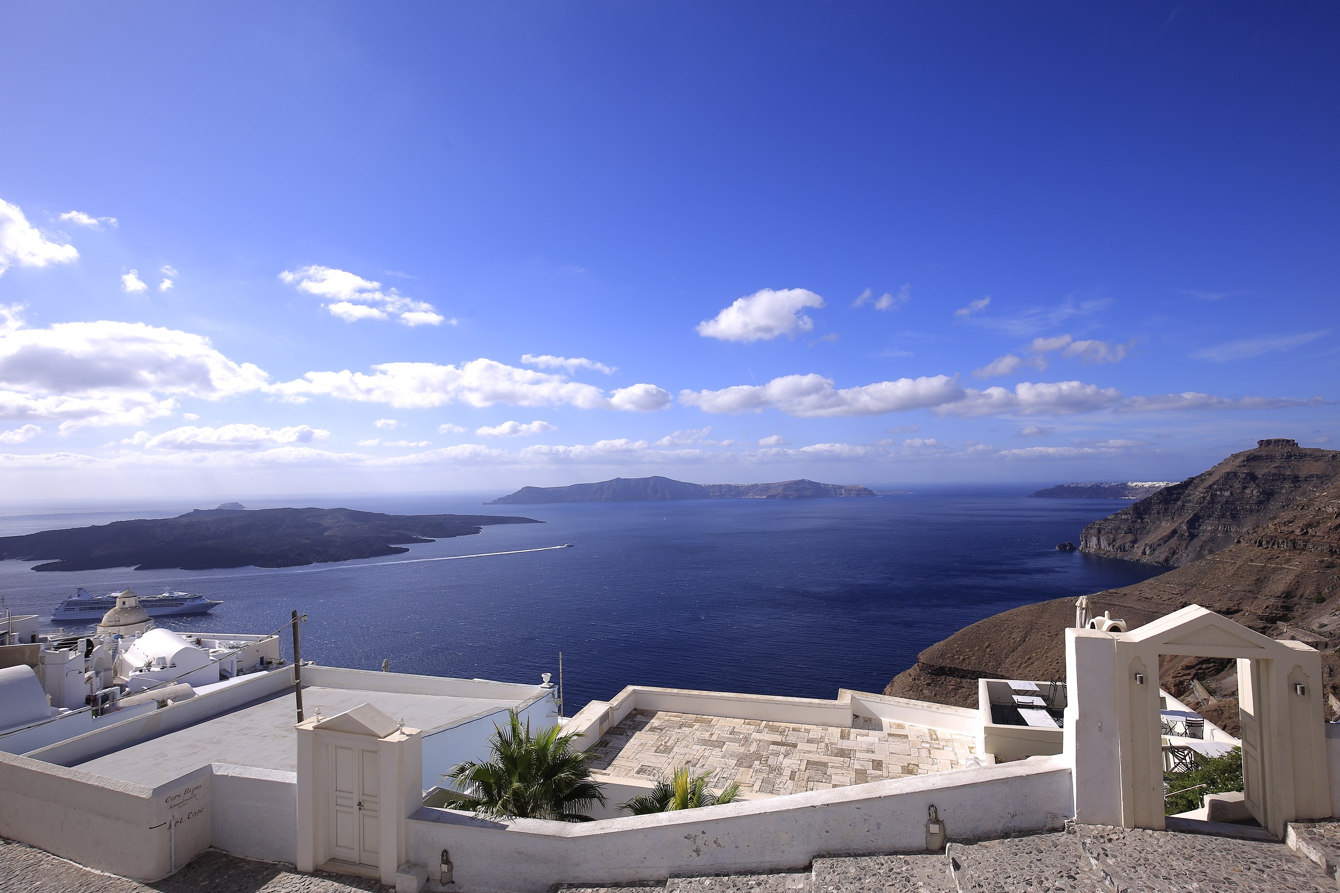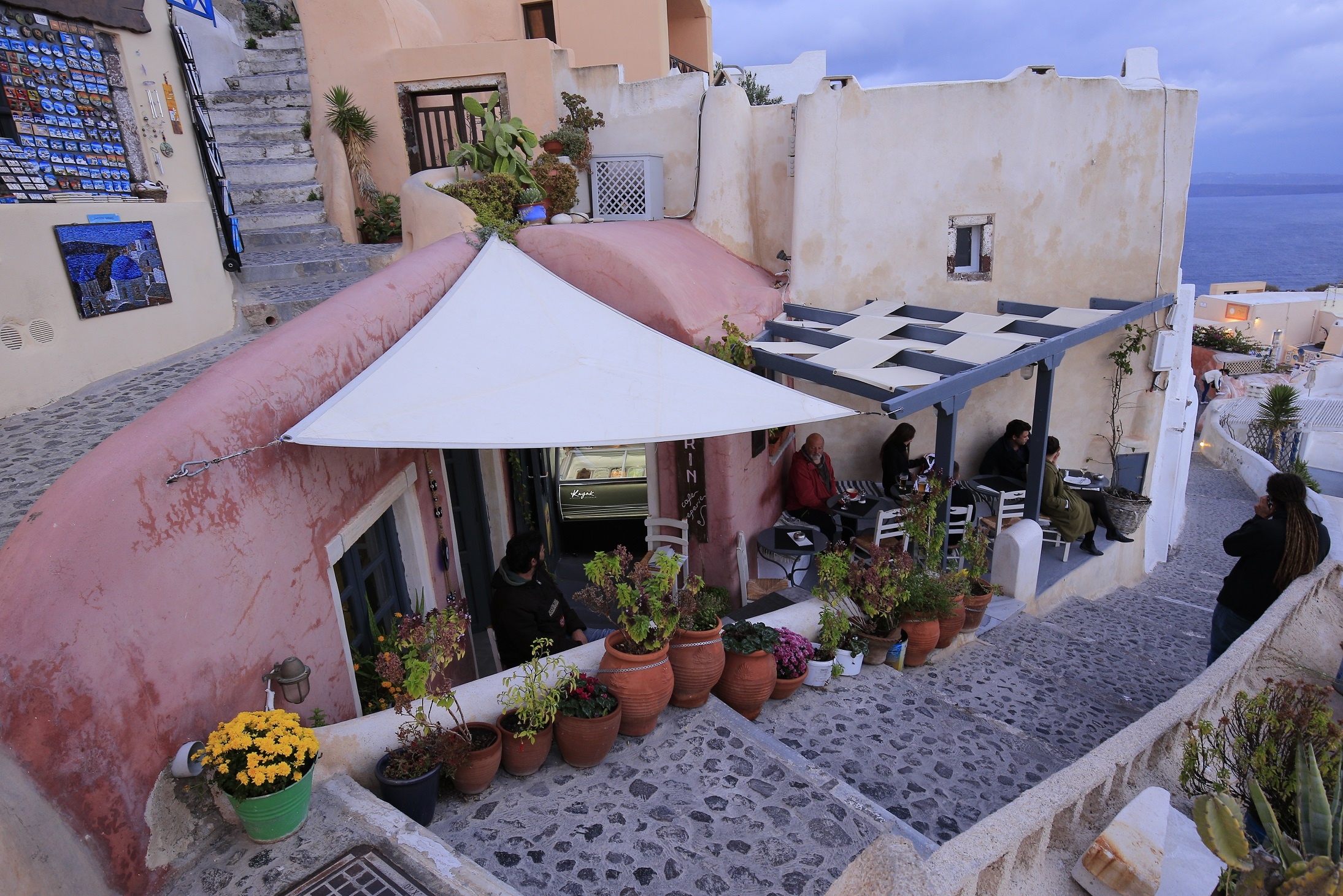 Con đường ven bờ đông đảo, nối giữa Fira và Imerovigli còn đẹp hơn những gì ta thấy trên tranh ảnh: sơn trắng, rải sỏi, chỉ dành cho người đi bộ, chiều ngang chừng hai mét rưỡi, và nối với những căn nhà bám vào vách núi, với các bậc cầu thang, cổng trắng và quán cà phê. |
