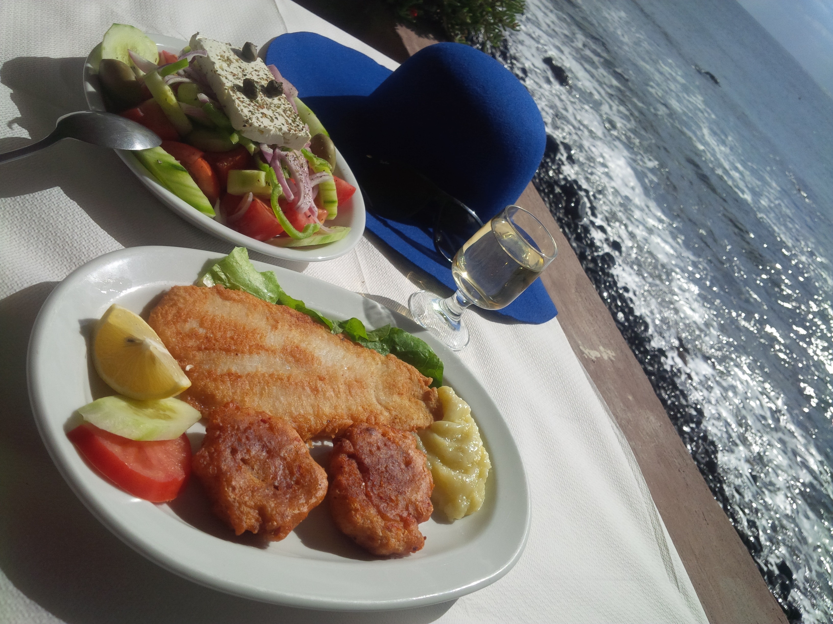 Santorini là cụm đảo uốn cong hình chữ C ngược. Đầu ngày, chúng tôi bắt xe bus xuống phía nam, với đích đến là các bãi biển đen, biển đỏ, và xa hơn là hải đăng Faros. Chúng tôi chọn một nhà hàng ven biển, mỗi người lấy một suất ăn gồm rượu vang, cá hồng, các loại salad với thật nhiều phô mai và quả olive giá 10 euro. Trong lúc chờ ông chủ chuẩn bị đồ, chúng tôi xuống bãi biển, chọn những viên đã núi lửa đen nổi tiếng để mang về làm kỷ niệm. |