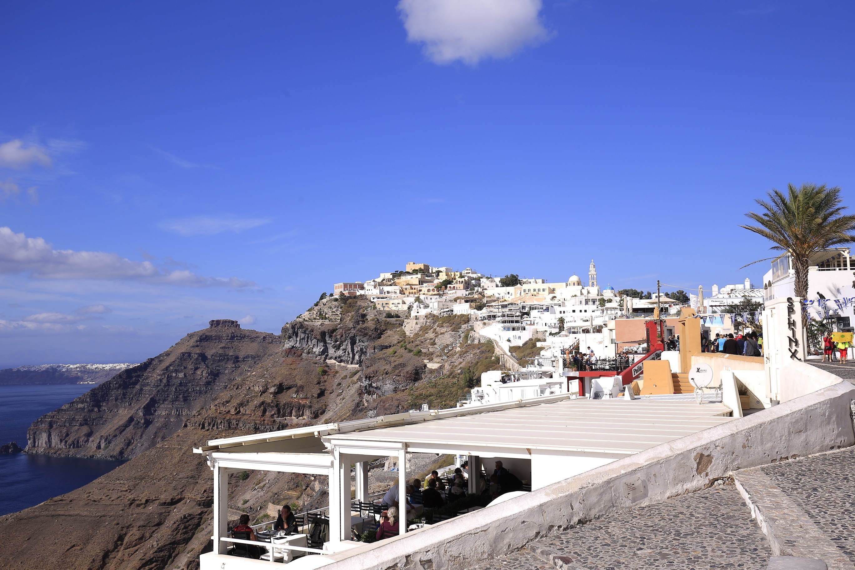 Kế hoạch của nhóm là buổi sáng ở các bãi biển làng Akrotini này, buổi trưa quay lại Fira - làng trung tâm và lang thang đi bộ đến làng Imerovigli, buổi chiều bắt xe bus đến làng Oia để ngắm hoàng hôn. Sau bữa sáng ở bãi biển đen, chúng tôi leo lên xe bus về lại trung tâm. Trên hành trình này, toàn cảnh chữ C mềm mại trên đảo, với sườn núi còn nguyên vân núi lửa, những công trình trắng muốt, và màu nước biển xanh mê hoặc sẽ khiến bạn nhớ mãi. Trong hình là ảnh chụp làng Fira. |