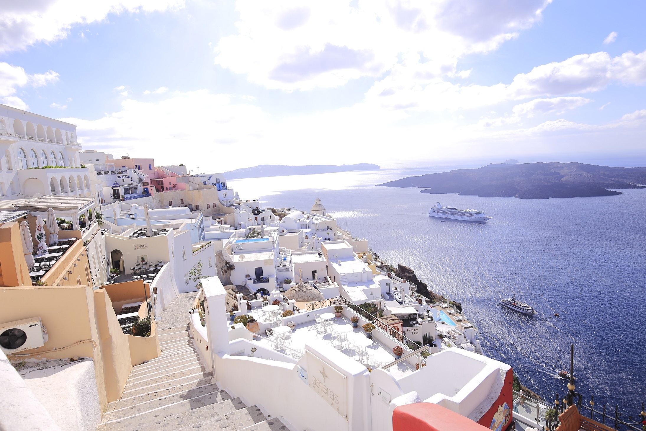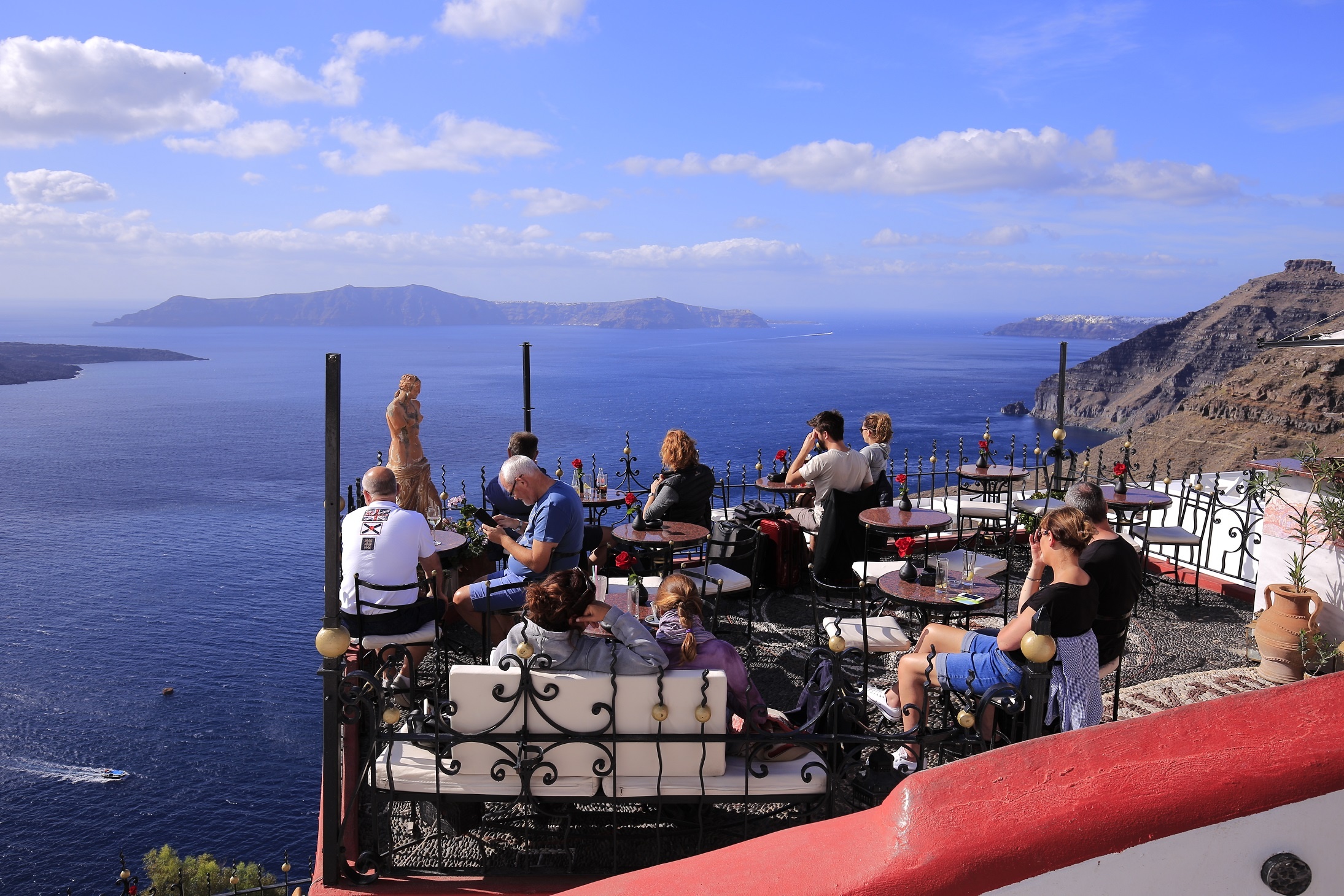 Khách sạn và ăn ở: Giá khách sạn ở Santorini phụ thuộc vào thời điểm bạn đi du lịch. Chúng tôi thuê phòng đôi tháng 10 là 30 euro một đêm, có xe đón từ sân bay, nhưng giá cho tháng 8 lên đến 130 euro, và phải đặt trước nửa năm. Đồ ăn ở Santorini nhiều hải sản, chế biến hợp khẩu vị với người Việt hơn nhiều thành phố châu Âu khác, và càng xa làng Fira giá càng rẻ (8-12 euro một bữa). Một đặc sản khác trên đảo là bánh Gyros: bên ngoài gần giống bánh mì, cuộn tròn hình cái phễu, bên trong là thịt cừu hoặc thịt lợn và khoai tây chiên, cà chua. Giá 2,5-3 euro một chiếc.