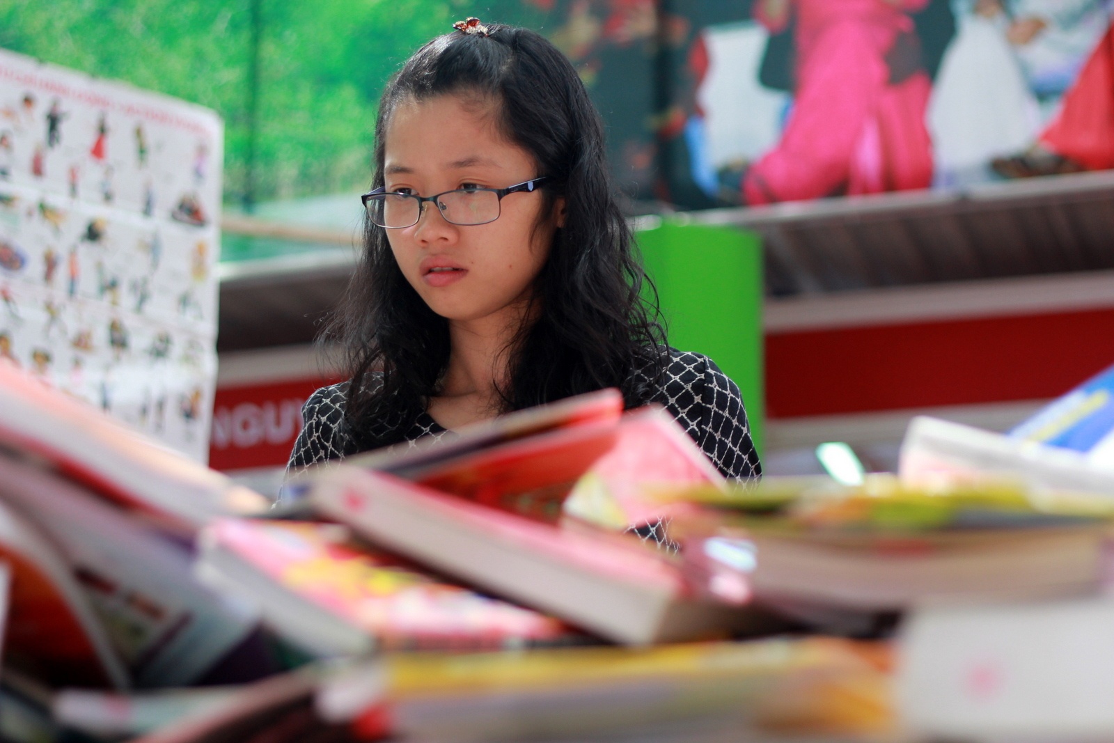 | Bạn Đặng Diệu Uyên (24 tuổi) phân vân trước quá nhiều sách. Uyên cho biết, trước "rừng" sách giảm giá hấp dẫn nên nhìn quyển nào cũng muốn mua. |
