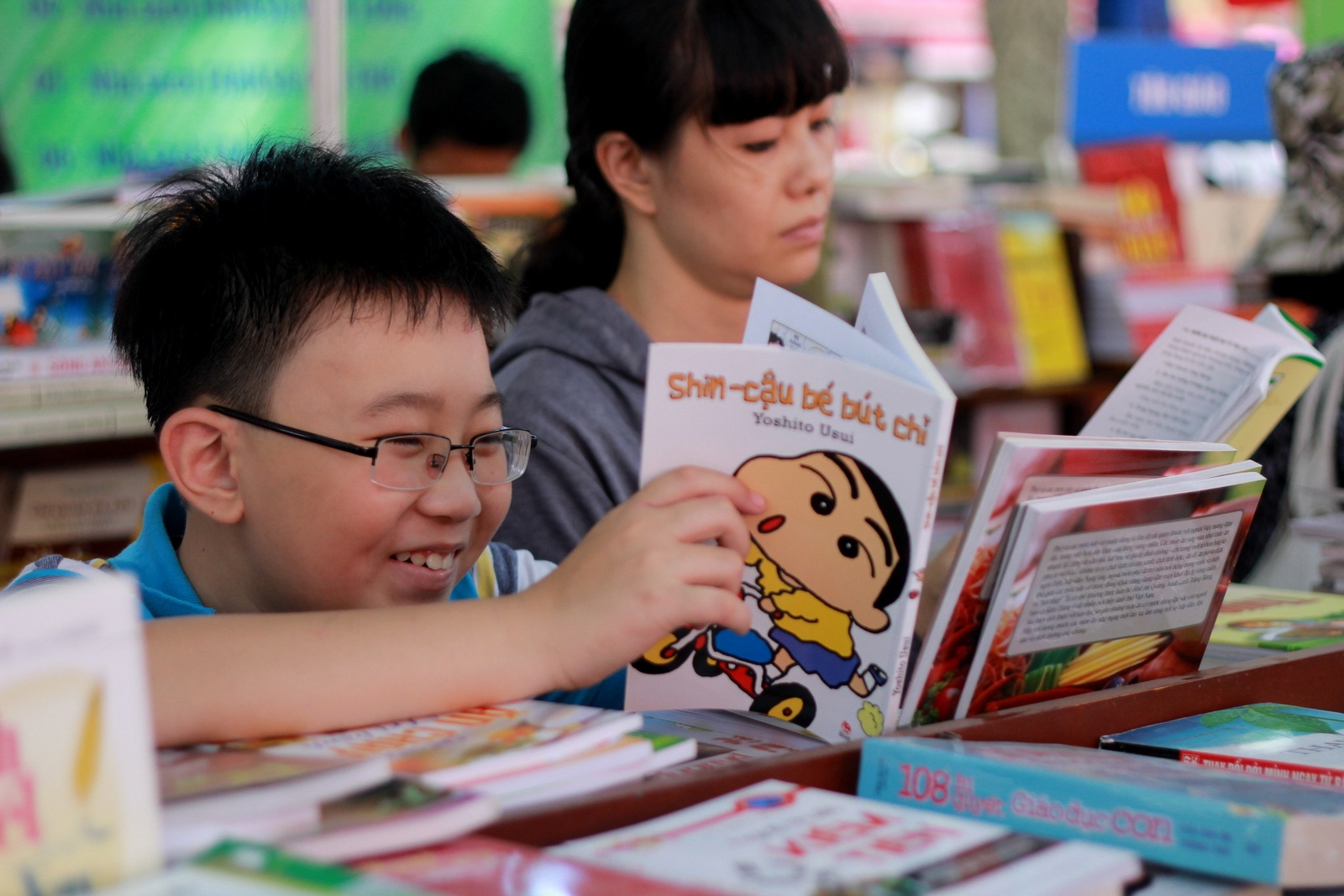 | Không quan tâm đến mua sách giảm giá, cậu bé này chăm chú đọc quyển truyện tranh mình yêu thích. |