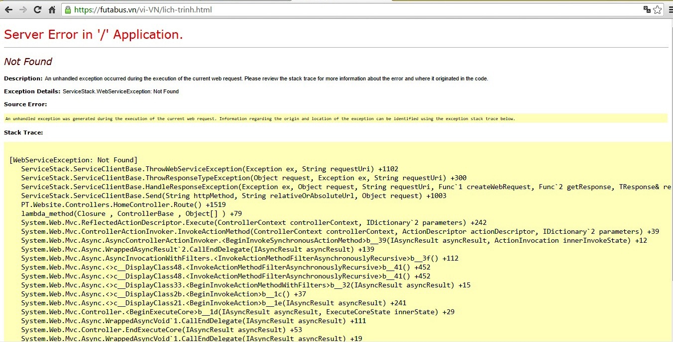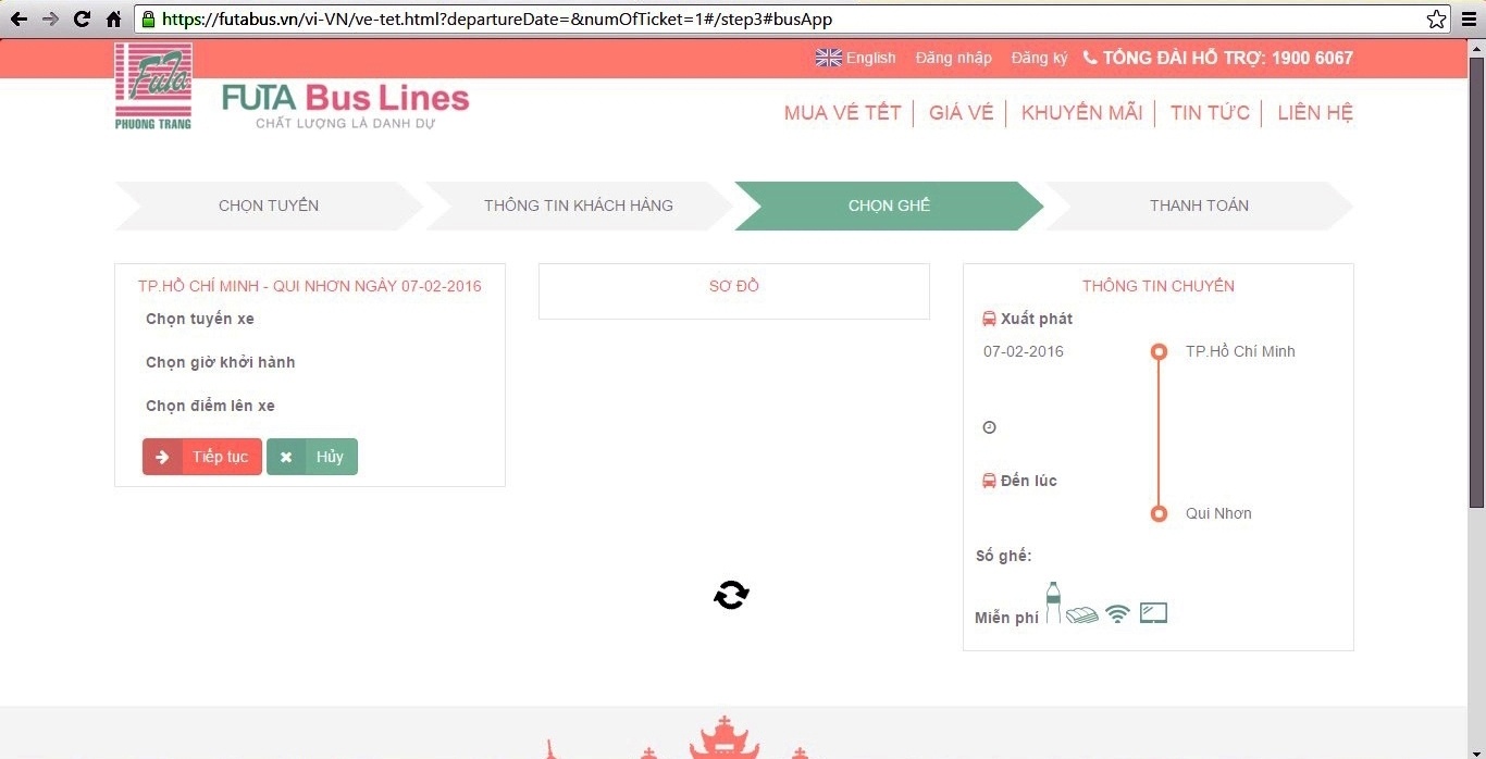 Thực hiện thao tác mua vé online trên trang web futabus.vn của công ty Phương Trang, phóng viên nhiều lần bị báo lỗi “Server Error in ‘/’ Application”. Thực hiện lại, vài lần phóng viên thao tác được một số bước thì cũng xuất hiện mũi tên chạy vòng tròn liên tục như anh Nguyên.