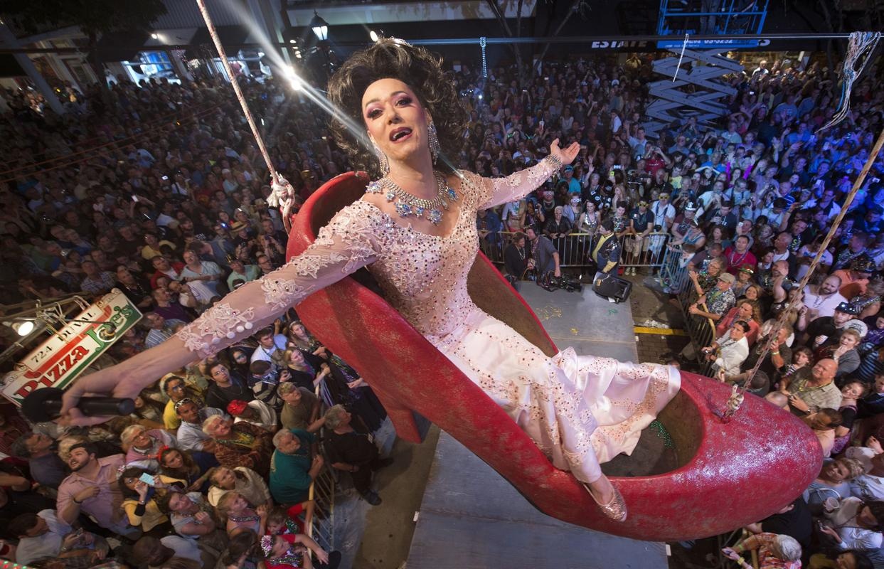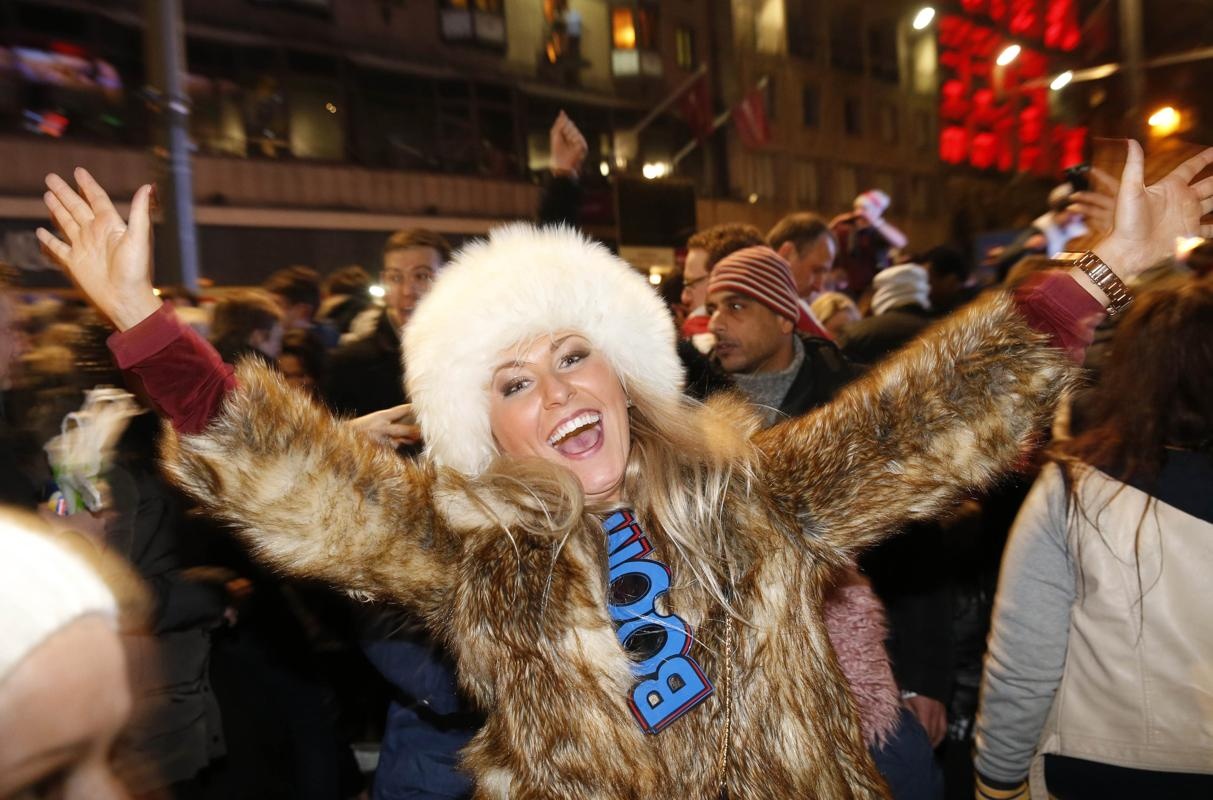 Một nghệ sĩ trình diễn trong chiếc giầy khổng lồ ở thành phố New York, Mỹ trong những phút đầu tiên của năm 2014. Ảnh: Reuters