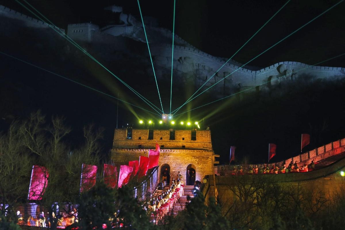 | Những đèn laser phát sáng từ một vị trí trên đoạn Vạn lý trường thành ở Bắc Kinh, Trung Quốc. Ảnh: AP |