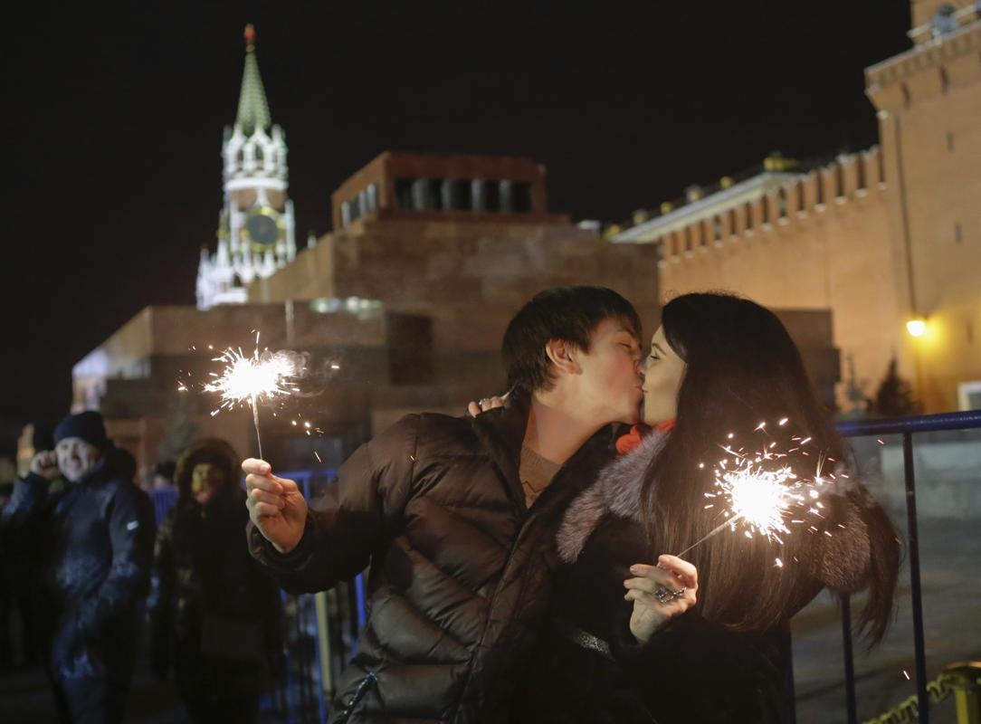 | Đôi tình nhân hôn nhau tại quảng trường Đỏ ở thành phố Moscow. Ảnh: Reuters |