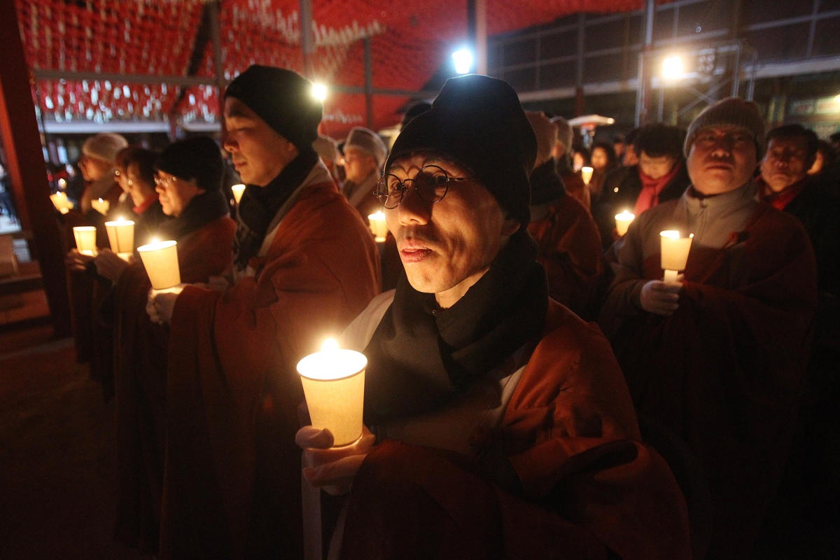 Các nhà sư làm lễ đầu năm trong chùa Bongeun ở thành phố Seoul, Hàn Quốc. Ảnh: AP