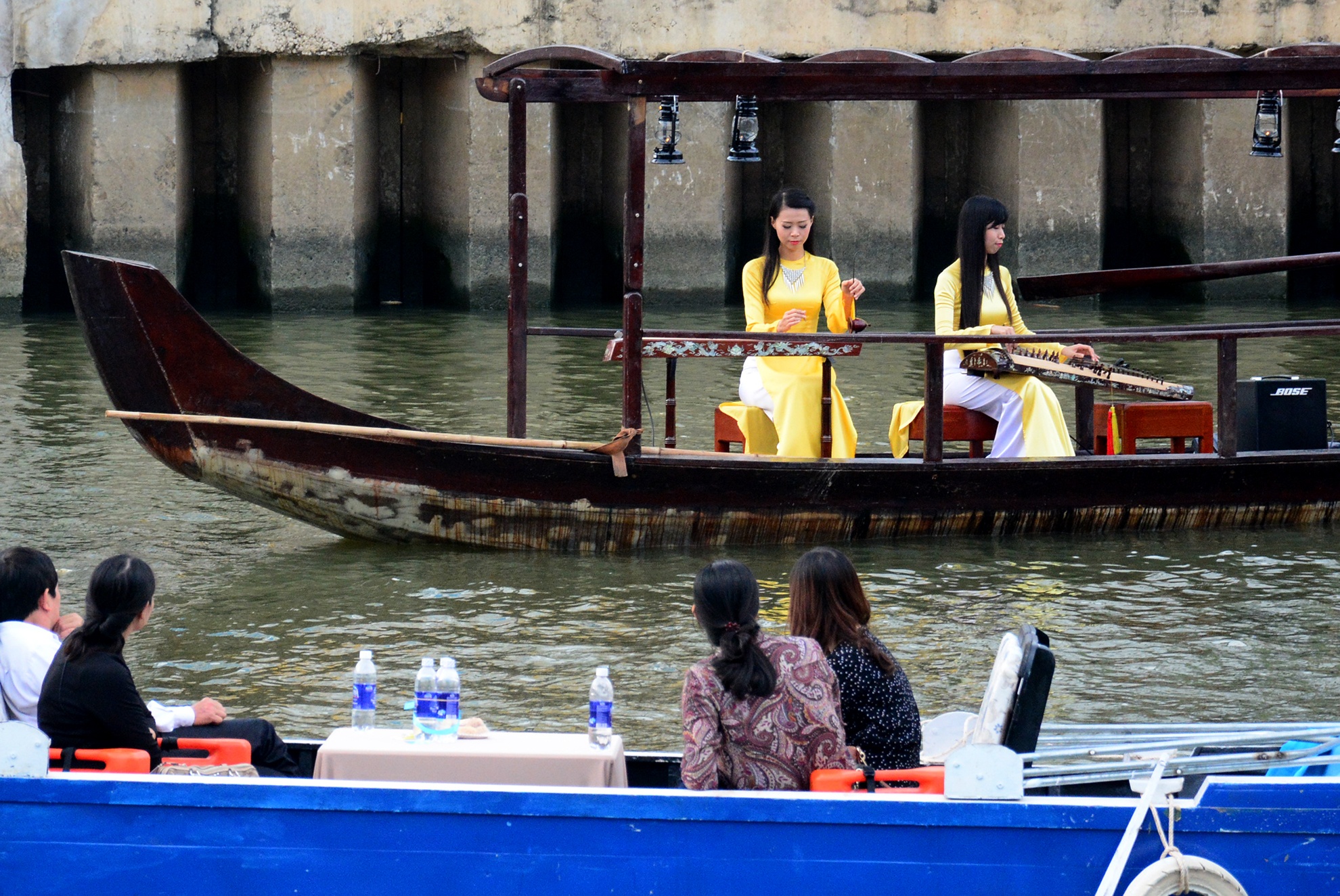 Ngồi trên thuyền du ngoạn dọc theo kênh Nhiêu Lộc - Thị Nghè (TP HCM), du khách thoải mái ngắm cảnh và thưởng thức những bản nhạc dân tộc.