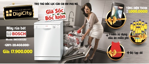 Là thương hiệu nổi tiếng, Bosch đang phối hợp với DigiCity trợ giá máy rửa bát thông minh Bosch với giá cực kỳ hấp dẫn, chỉ 17,9 triệu đồng cho sản phẩm SMS50E82EU, cùng quà tặng là 1 chiếc điện thoại di động trị giá 1 triệu đồng, kèm 1 năm sử dụng dầu ăn Simply hoặc Neptune. Đặc biệt, công ty triển khai chương trình trải nghiệm thực tế và sử dụng thử máy rửa bát Bosch, để người tiêu dùng hiểu được giá trị tại sao nên mua sản phẩm này.