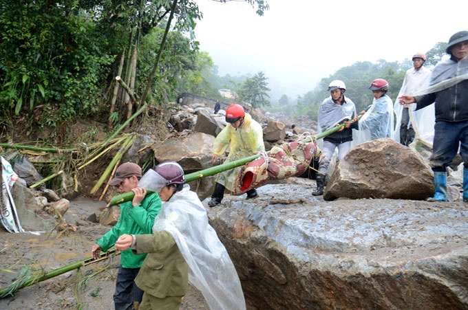 | Chấp nhận trôi theo dòng lũ, thầy Trung bị rách hết phần da từ đầu gối xuống gần dưới bàn chân. Còn cô Ngàn dù được che chở vẫn bị thương phần mềm. May mắn, kết quả siêu âm bước đầu cho thấy thai nhi không bị ảnh hưởng. Trong ảnh: Dân quân tìm thấy một thi thể nạn nhân trong trận lũ quét ở thôn Can Hồ A, xã Bản Khoang, huyện Sa Pa, Lào Cai (ảnh chụp sáng 5/9). |