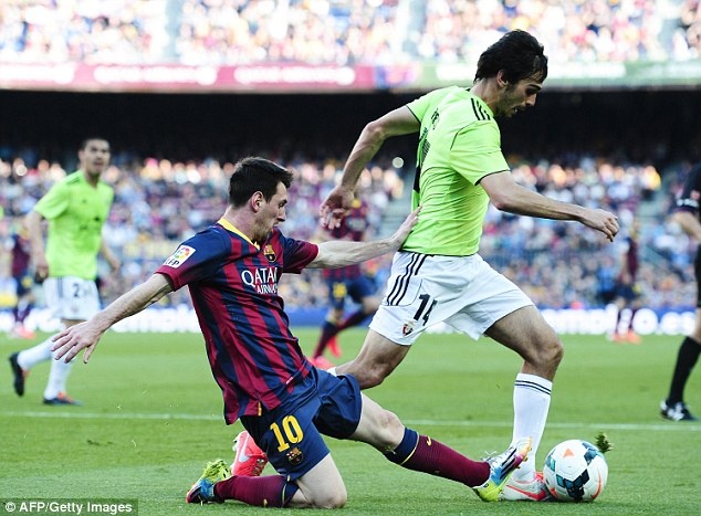 | Cầu thủ Osasuna luôn theo kèm Lionel Messi nhằm ngăn cản tiền đạo của Barca ghi bàn. |