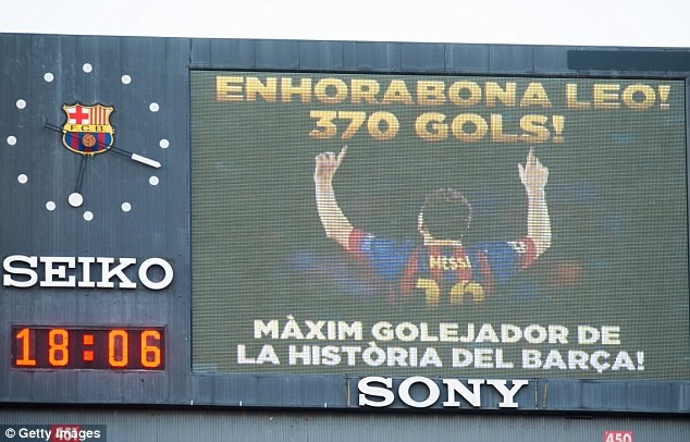 | Bảng điện từ ở sân Nou Camp chạy dòng chữ chúc mừng thành tích ghi bàn của Lionel Messi. |