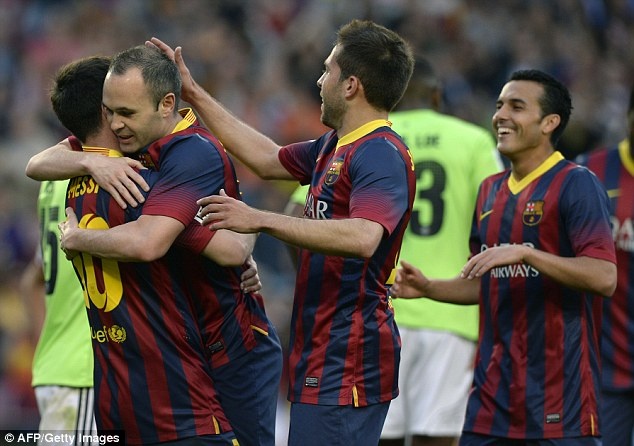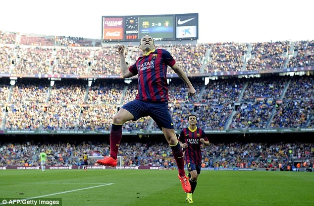 | Iniesta phấn khích với một bàn thắng cho Barca. |