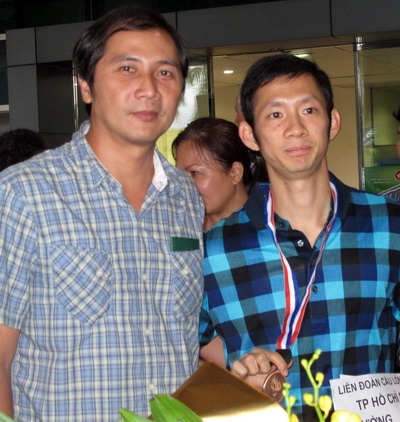 Máy bay hạ cánh từ 17h nhưng mãi đến 17h40, Tiến Minh và HLV của mình mới làm xong thủ tục. Cả hai bước ra sảnh trong niềm vui và sự hân hoan chào đón của gia đình, người thân. Đại diện lãnh đạo Sở Văn hóa, Thể thao và Du lịch, Liên đoàn cầu lông TP.HCM trao tận tay hai thầy trò những bó hoa tươi thắm và tiền thưởng.