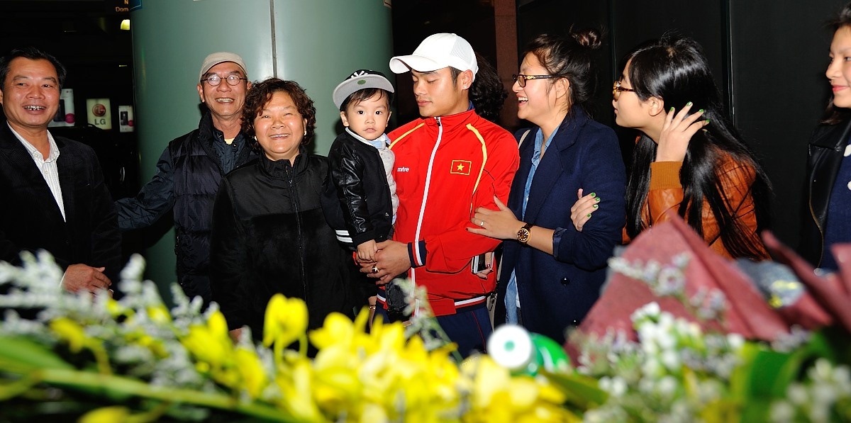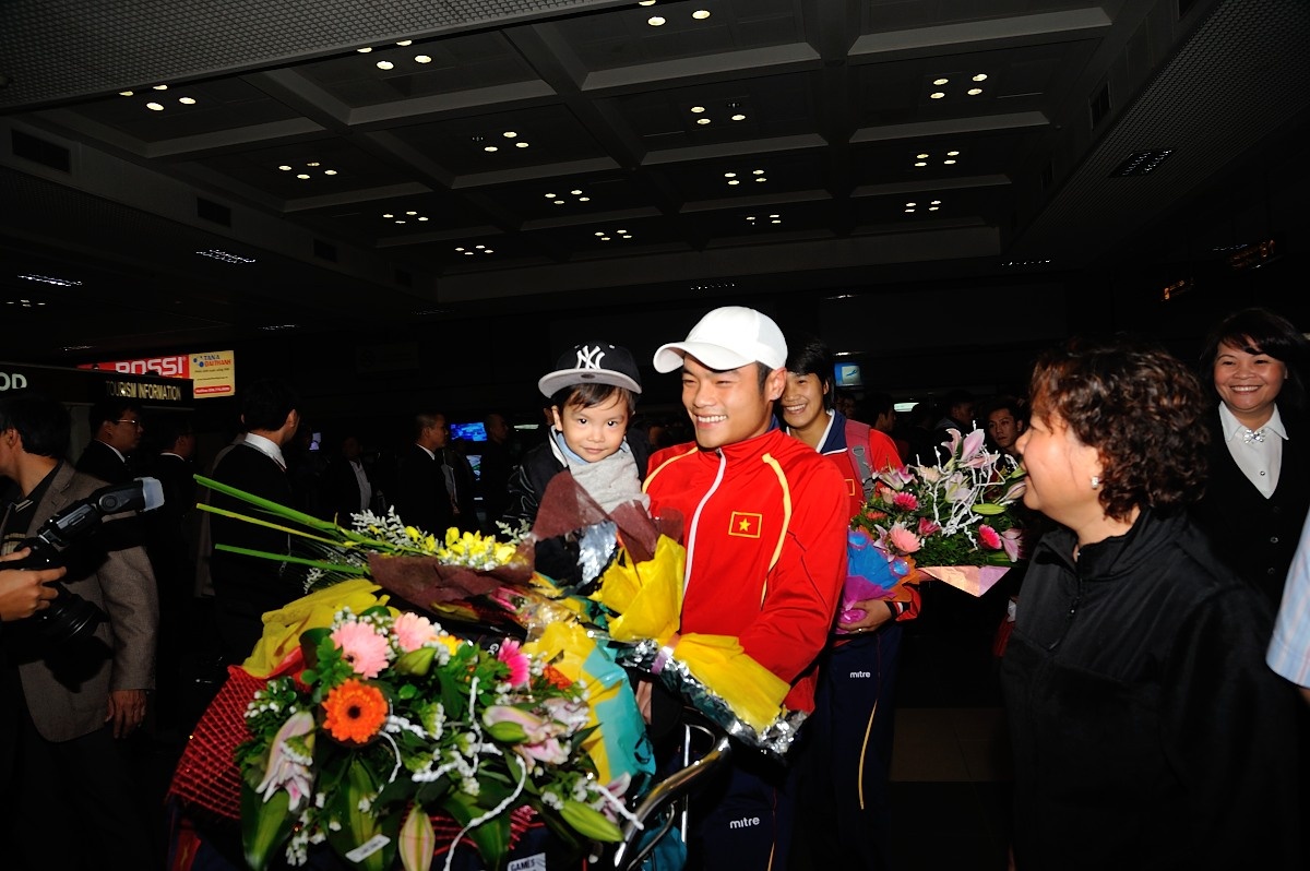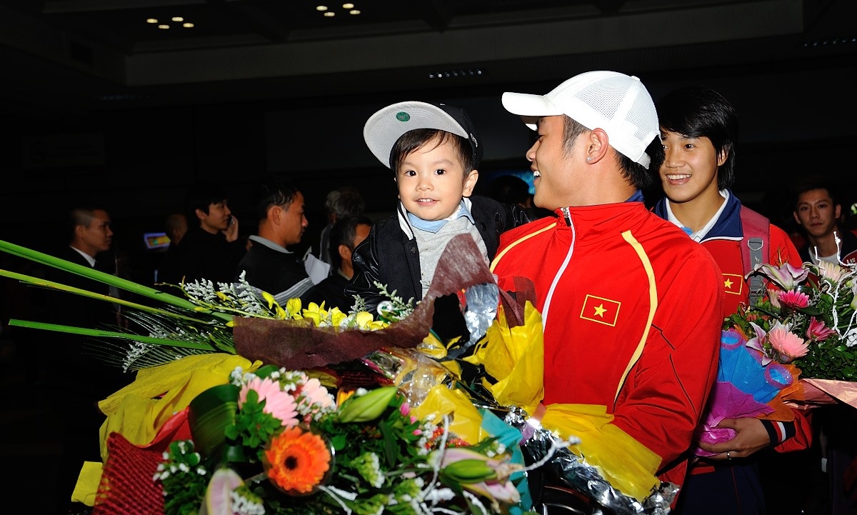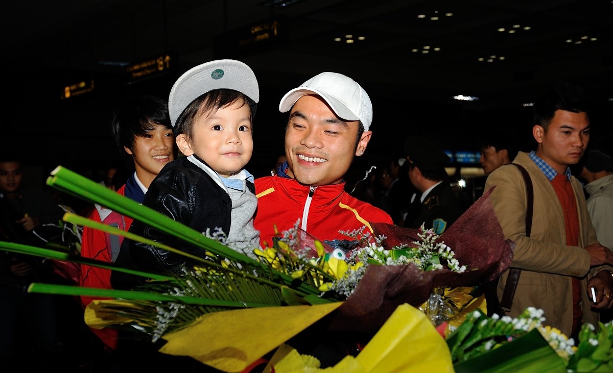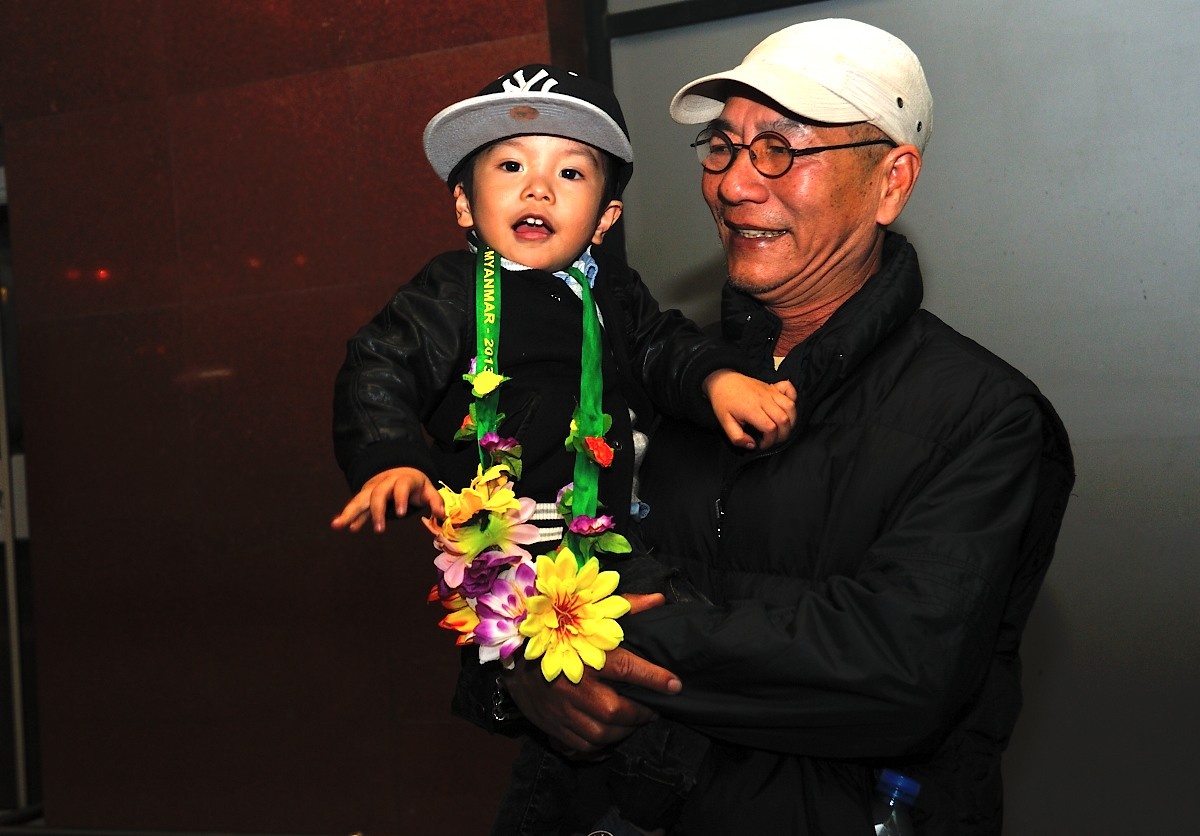 | Bé "Mốc" tự hào đeo vòng hoa chiến thắng mà bố Phạm Quốc Khánh được trao tại Myanmar. |