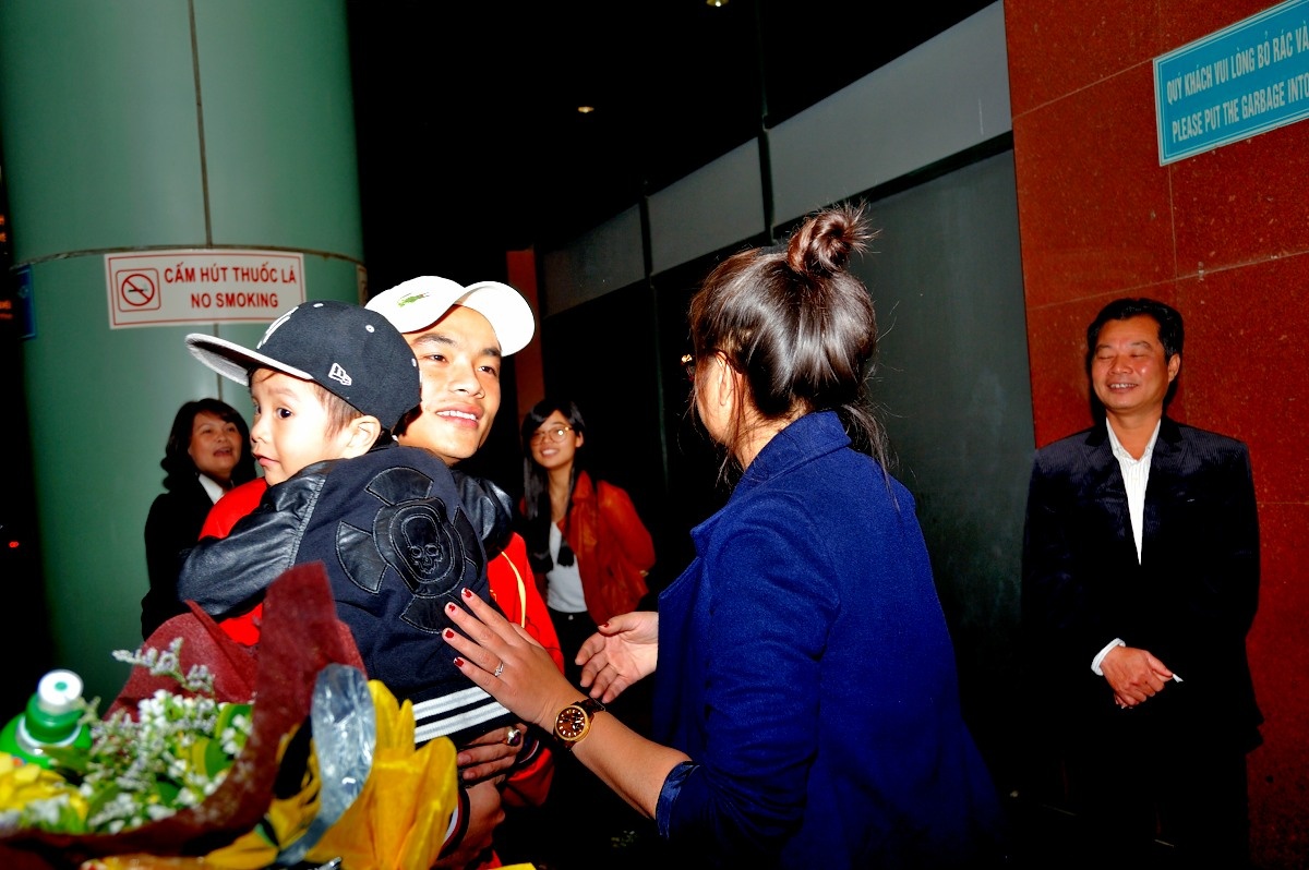 | Bé "Mốc" vừa tròn 2 tuổi rất kháu khỉnh khi vội sà vào vòng tay bố Phạm Quốc Khánh. |