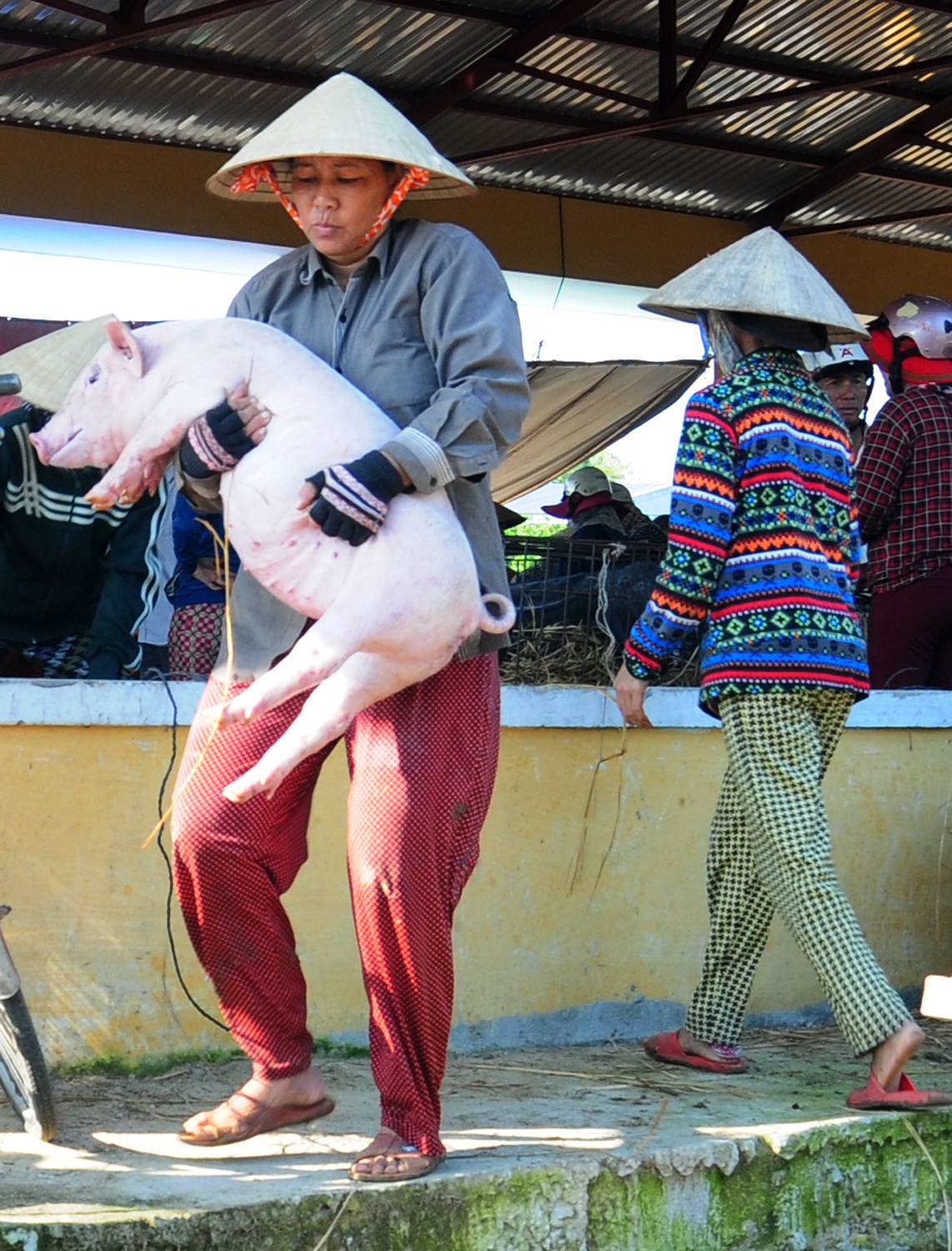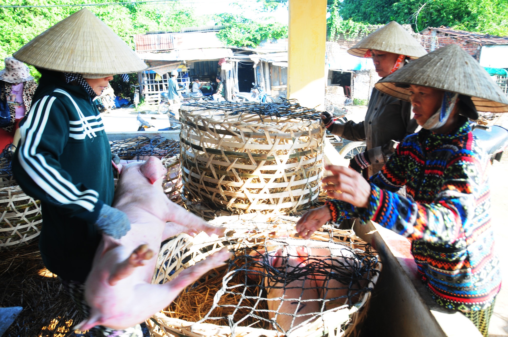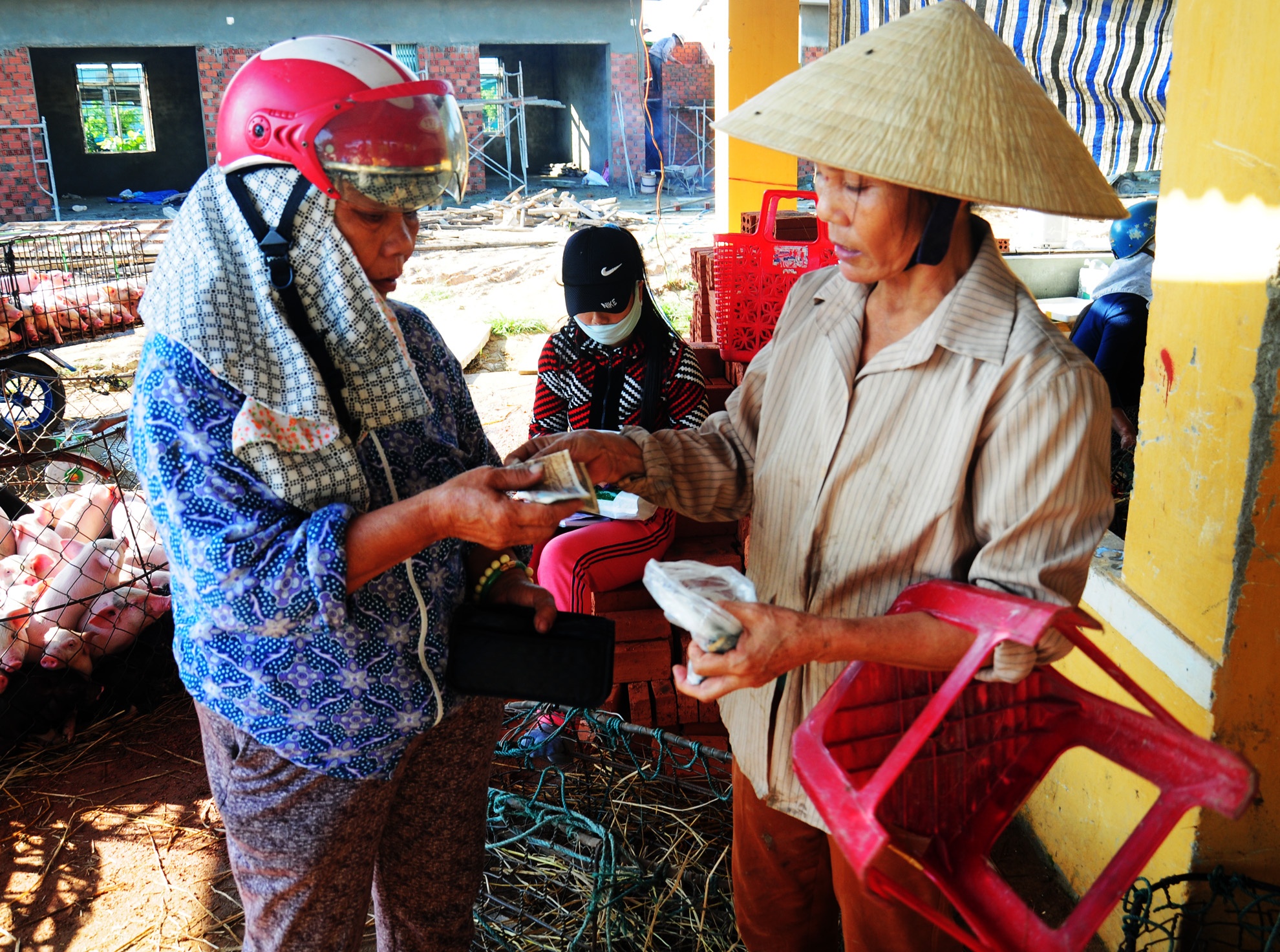 Thương lái trả công cho phụ nữ bế heo thuê. Nghề này vừa phải chịu khó, chấp nhận dơ bẩn lại ít tiền công nên đàn ông địa phương ít làm công việc này.