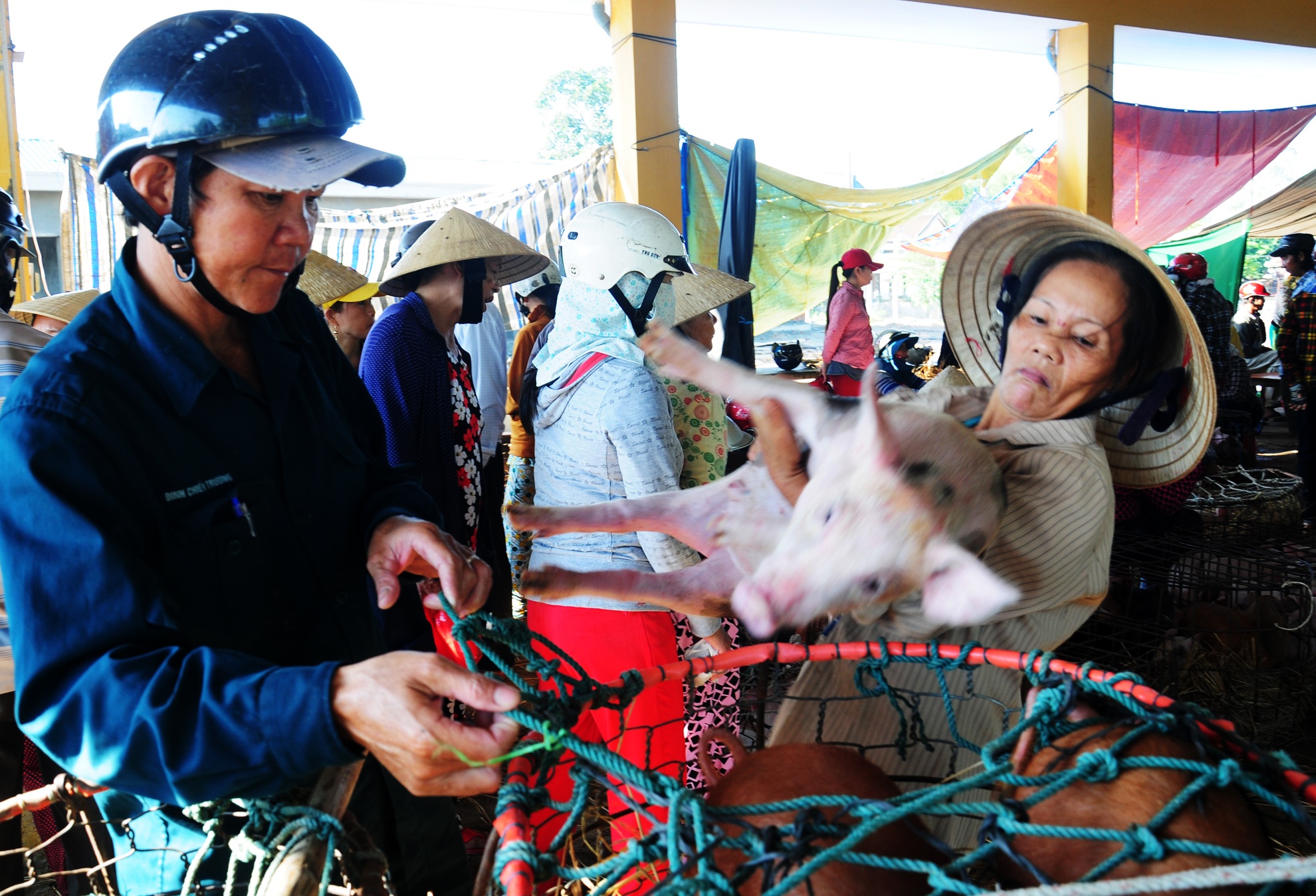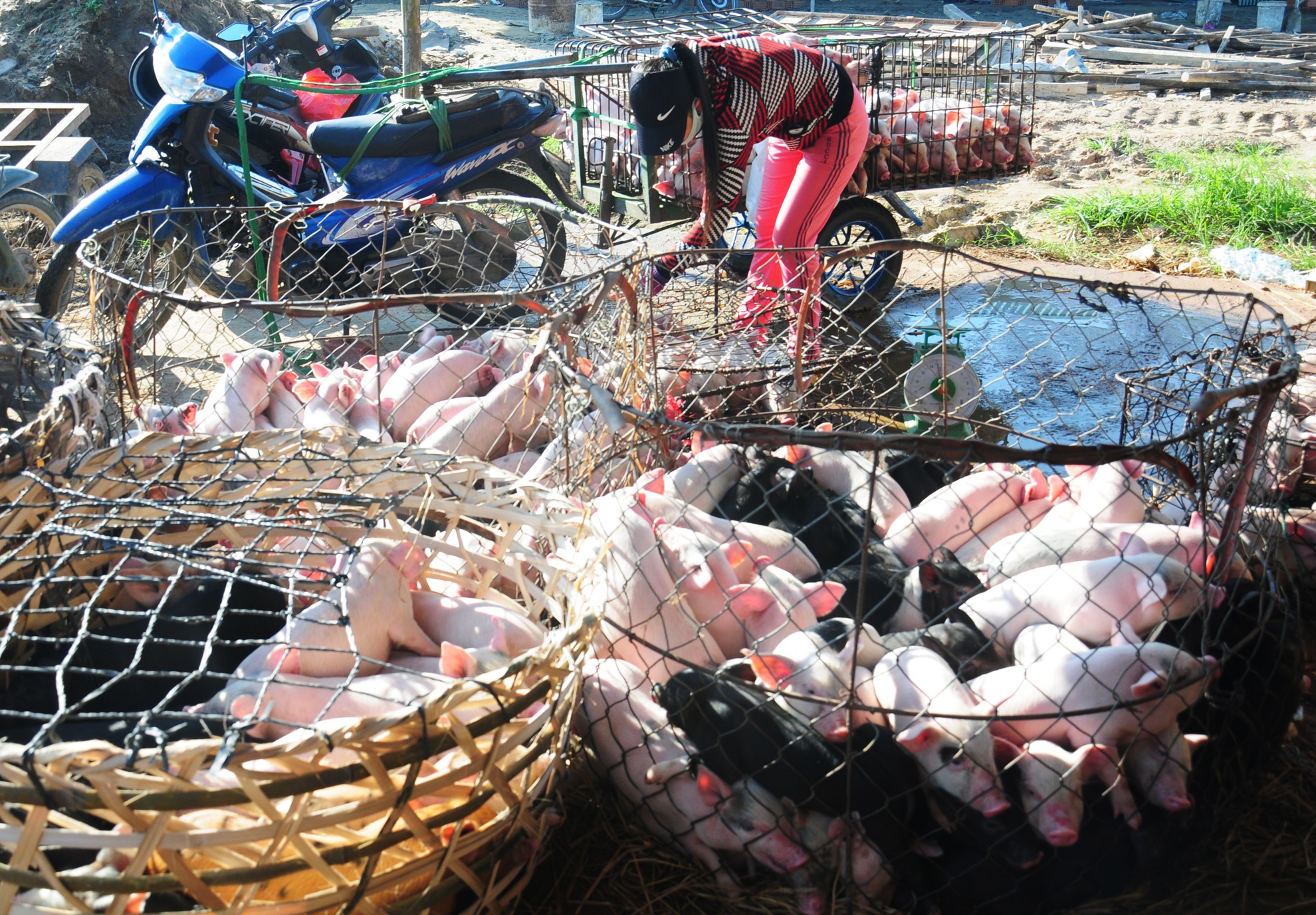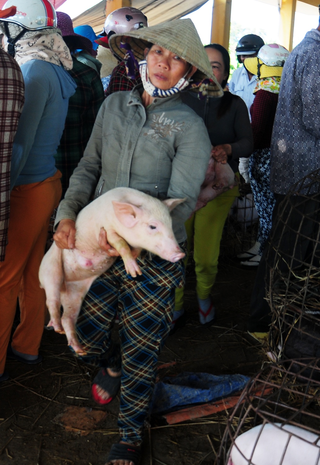 Thương lái trả công cho phụ nữ bế heo thuê. Nghề này vừa phải chịu khó, chấp nhận dơ bẩn lại ít tiền công nên đàn ông địa phương ít làm công việc này.