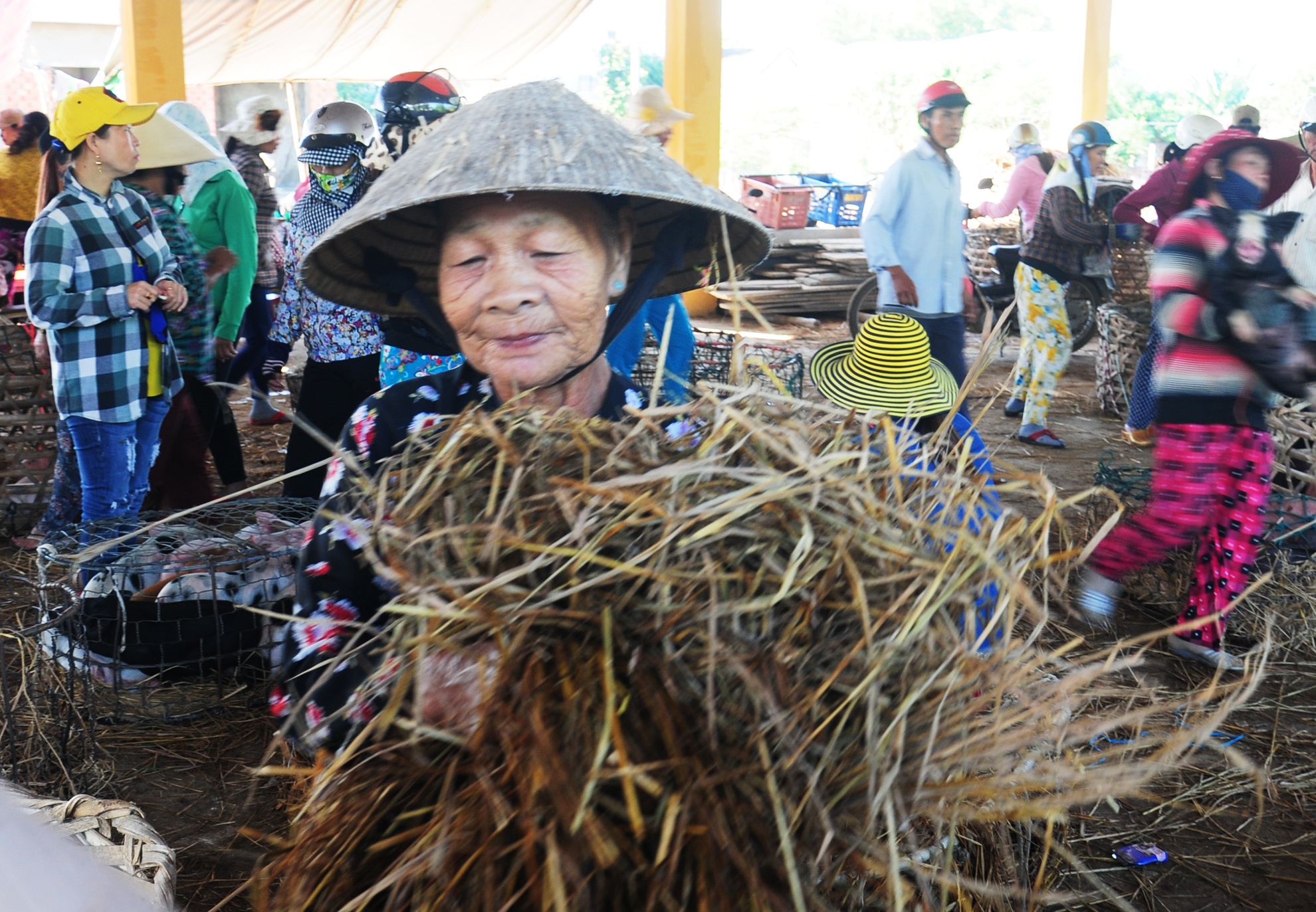 Khoảng 20 phụ nữ nghèo gắn chặt cuộc đời tại chợ Bà Rén (Quảng Nam) hàng chục năm qua làm nghề bế heo thuê từ nơi bán ra xe. Mỗi chuyến họ được trả từ 500 - 2.000 đồng/con.