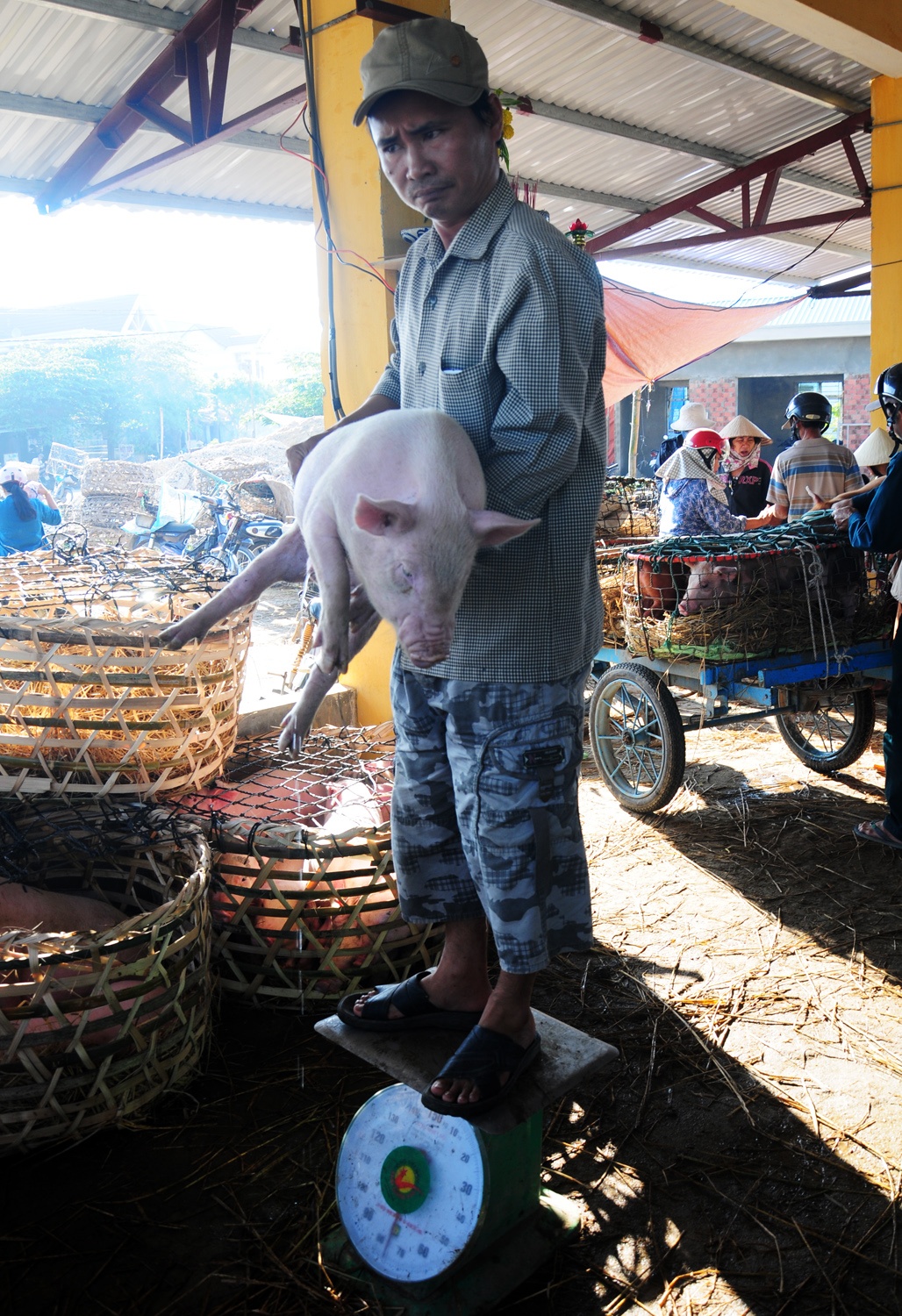 Cách đo trọng lượng nhanh chóng của người đàn ông này là ôm heo đứng trên bàn cân rồi trừ đi số kg cơ thể mình và biết con vật nặng bao nhiêu ký.