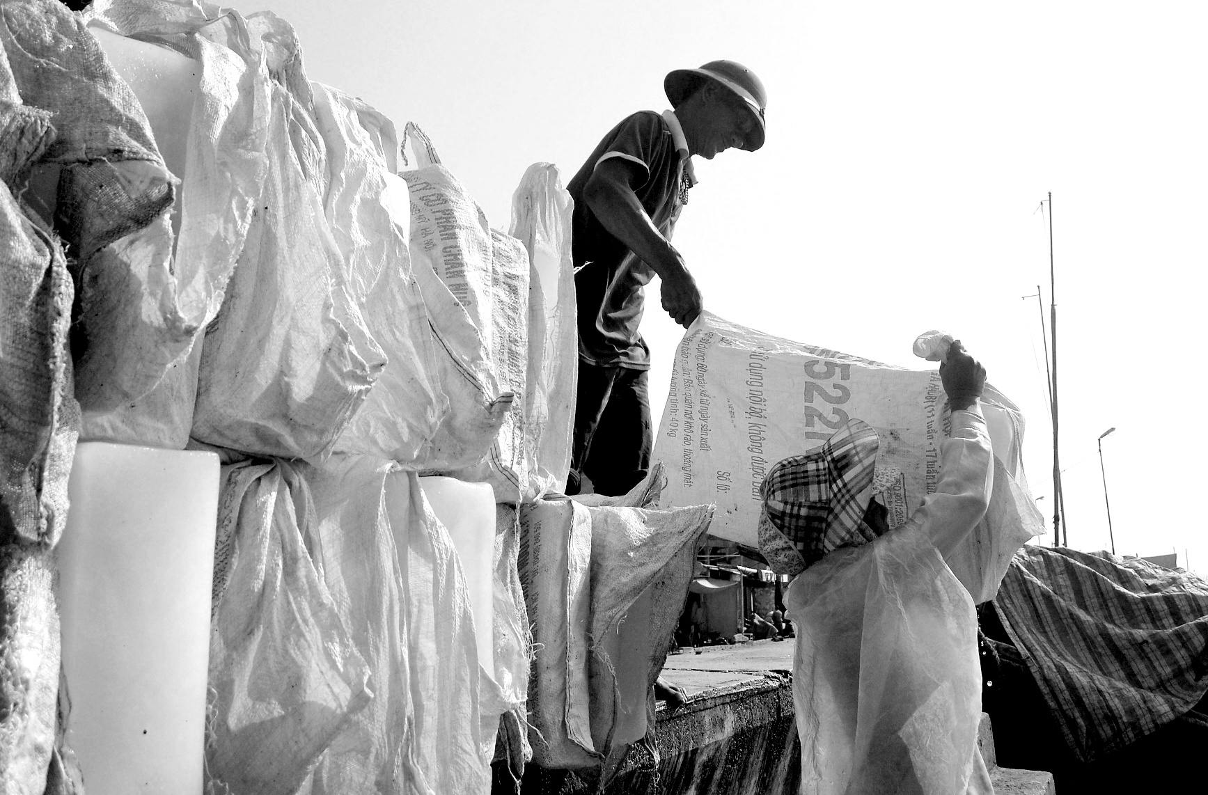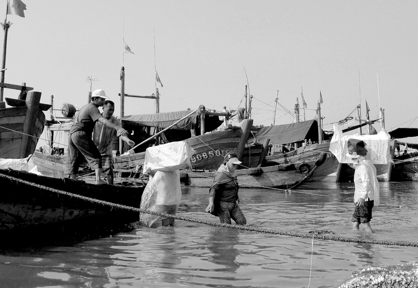 Chồng mất tích ngoài khơi, các bà vợ một mình, nhọc nhằn, vất vả nuôi con bằng nghề bốc vác đá lạnh. Hình ảnh tại làng góa phụ, cách thành phố Thanh Hóa 50 km.