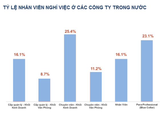 Nếu có sự so sánh về tình hình nghỉ việc của công ty Việt Nam và công ty nước ngoài, thì các công ty nước ngoài vẫn có tỷ lệ nghỉ việc ít hơn so với cụm công ty trong nước. Khối kinh doanh vẫn là lực lương biến động nhân sự nhiều nhất cho cả trong và ngoài nước.