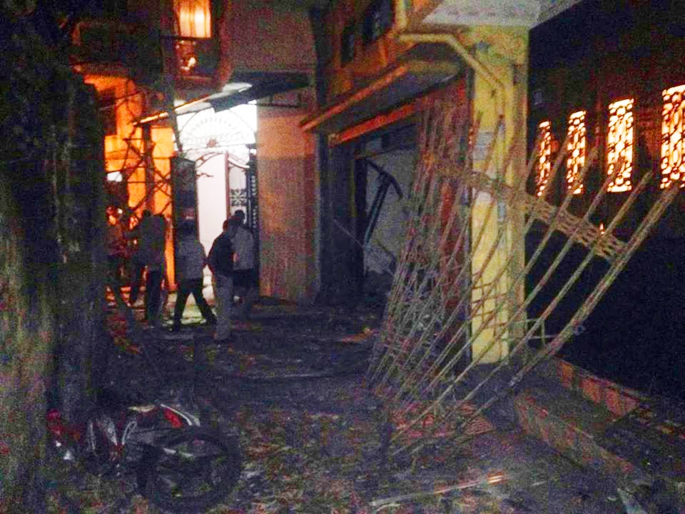 Tại tầng trệt của căn nhà, 2 chiếc xe máy cùng nhiều đồ đạc bị xé nát, sàn đầy các mảng tường, đồ vật rơi vỡ nằm lẫn vào nhau. Mùi thuốc pháo nồng nặc, khói trắng phủ kín không gian.