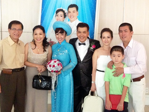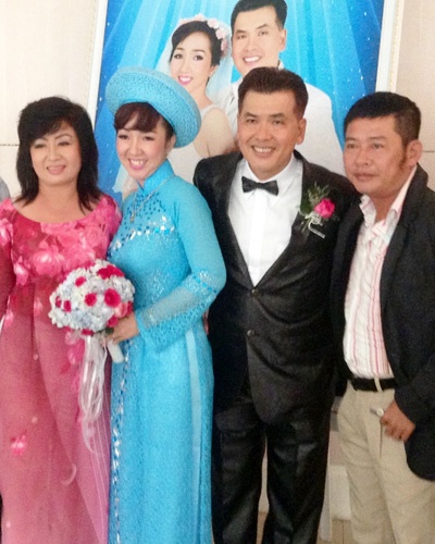 | Gia đình NSƯT Kim Xuân và nghệ sĩ hài Nhật Cường đến chúc mừng vợ chồng Hữu Nghĩa. |