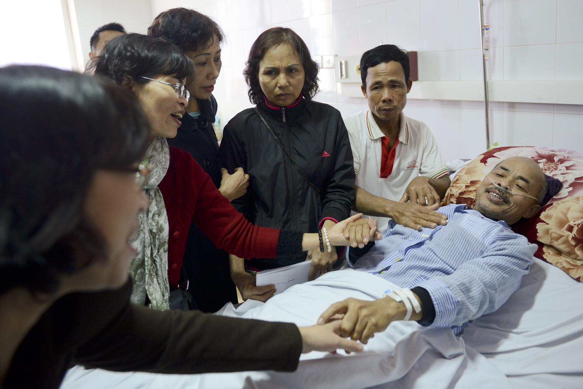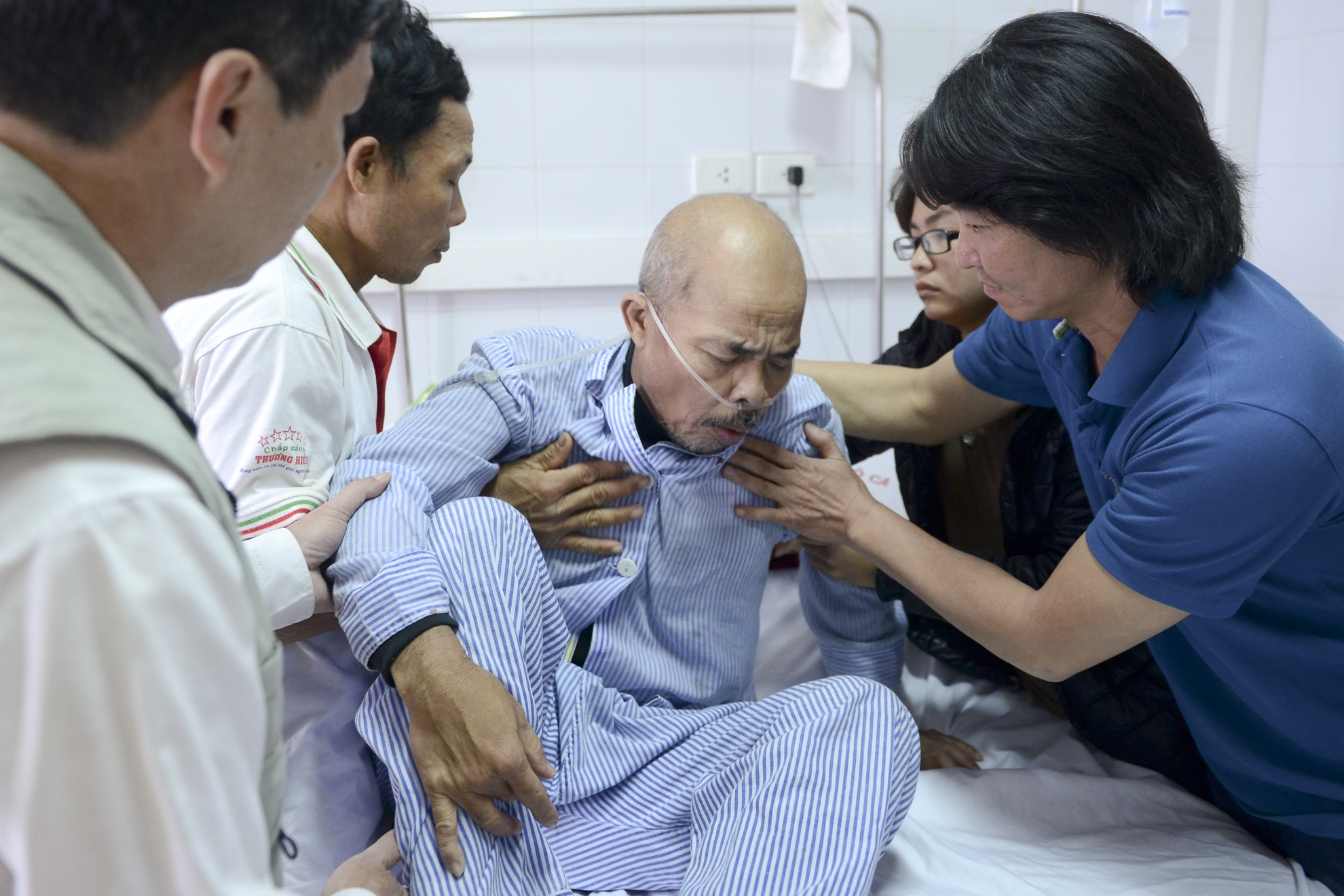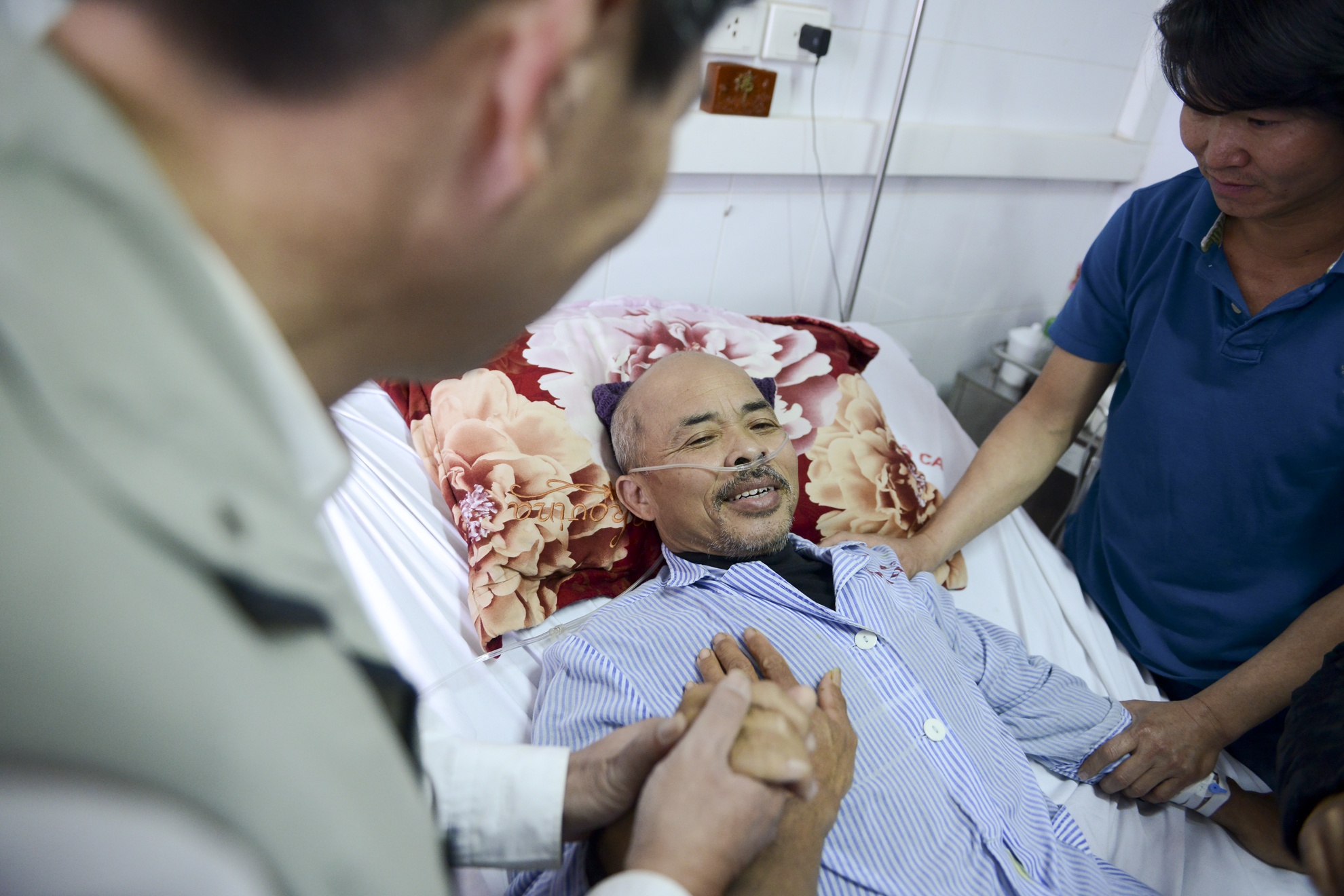 Sau hơn nửa tiếng chờ đợi, các bác sĩ đã thực hiện xong việc hút dịch. Người nhà và đồng nghiệp nhanh chóng vào phòng bệnh để đỡ nghệ sĩ Hán Văn Tình. Ông ho dữ khiến tất cả mọi người đều lo lắng.