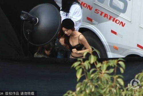 | Ôn Nhã rất bức xúc vì bị chụp trộm khi thay đồ để chụp hình tại hậu trường ngoài trời. |