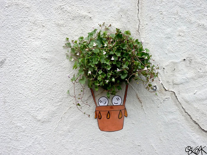 | Bằng việc kết hợp sáng tạo giữa những nhánh cây, ngọn cỏ và công trình, nhà cửa, bức tường, họ tạo ra các tác phẩm đường phố đầy tính nghệ thuật. |